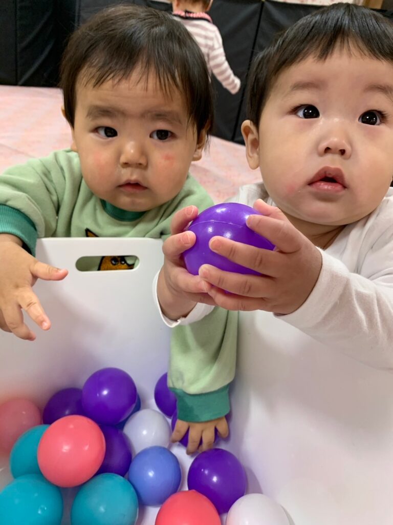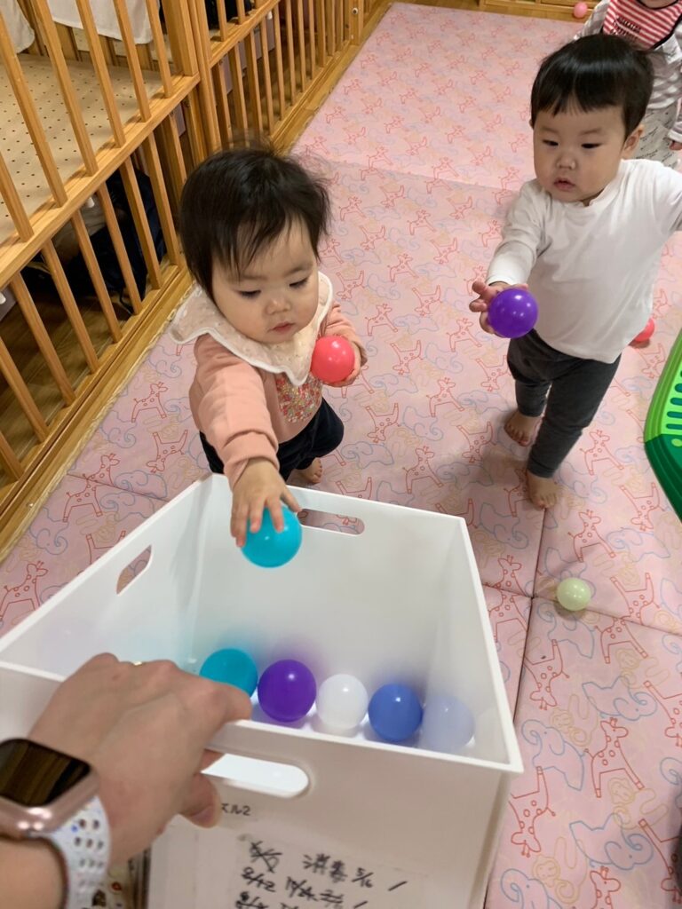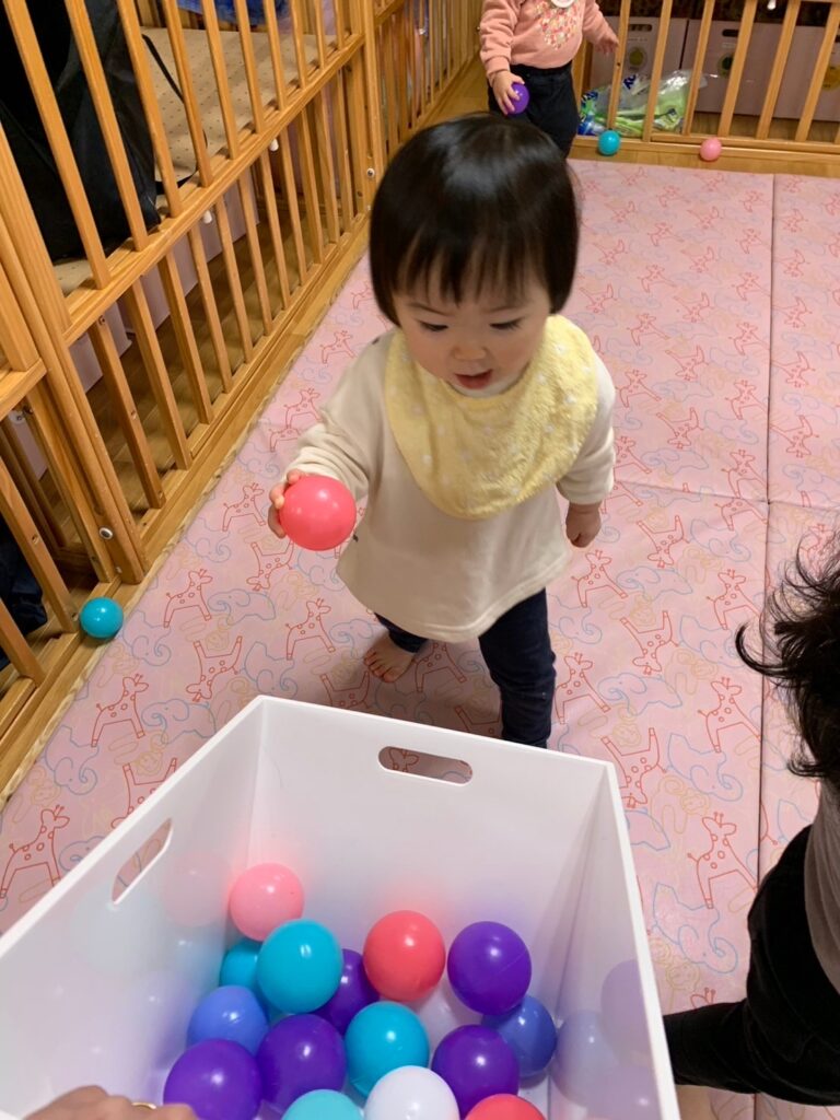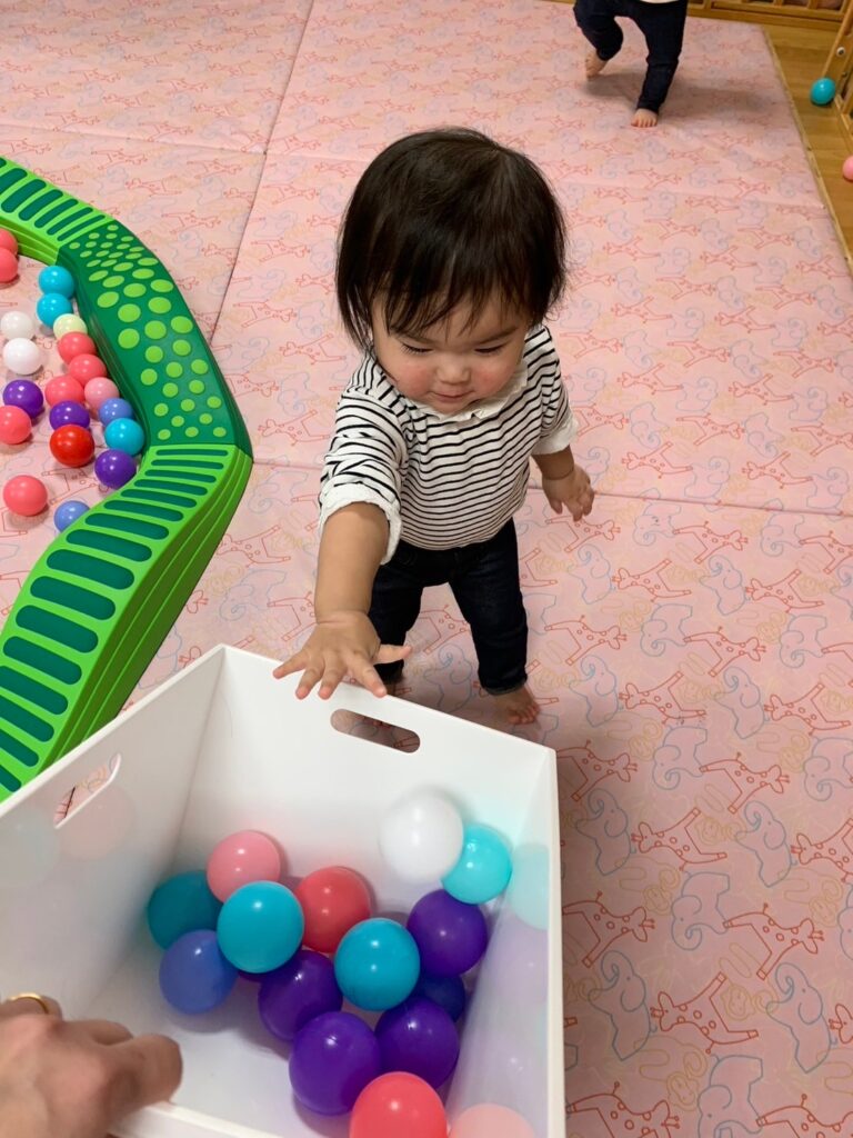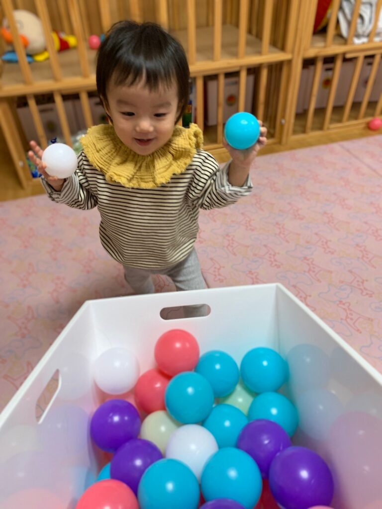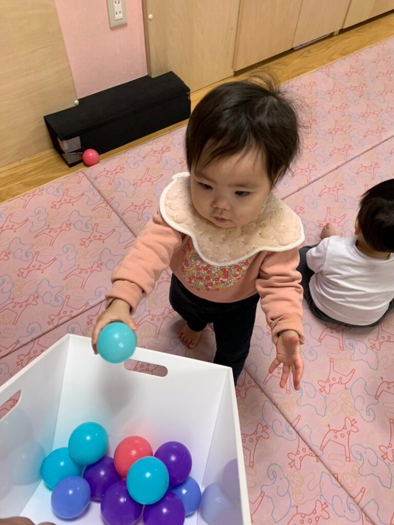 今日は箱の中にボールを投げて入れたり、集めたり……色々な楽しみ方をして遊びました。