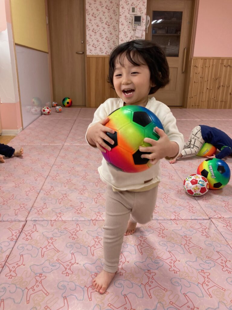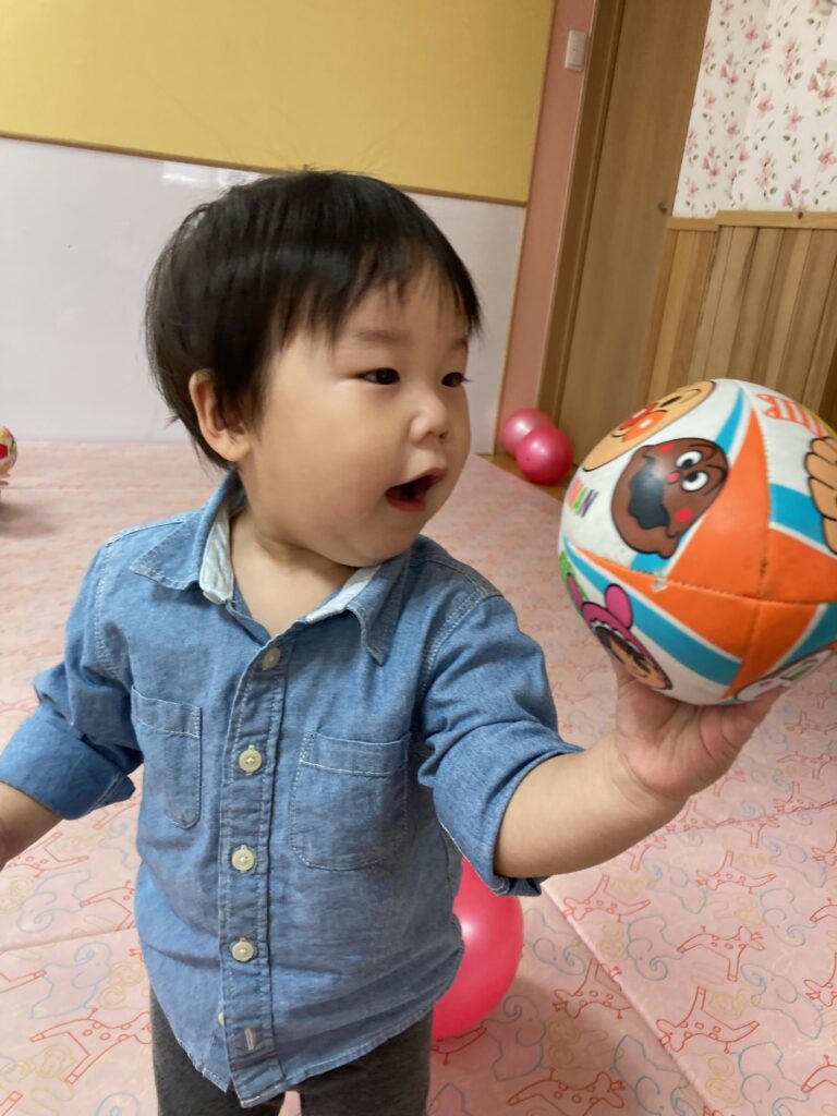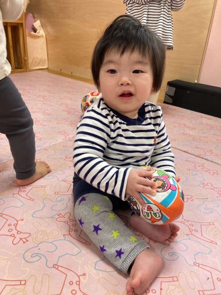 いちご組のみんなはボールを上手に投げたり、転がしたり。お友だち同士で「これ?」と、何やらお話しているような様子もありました。