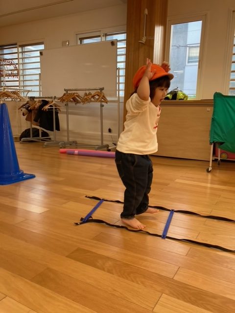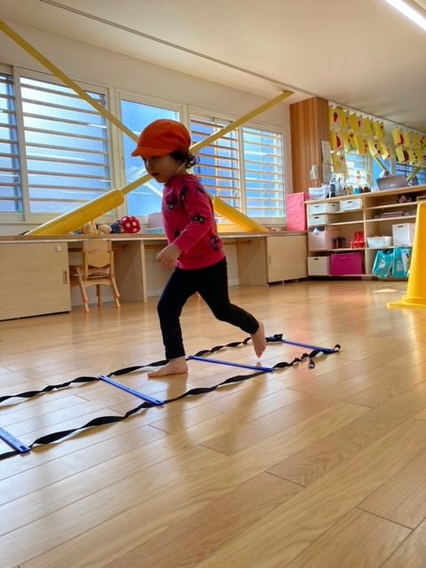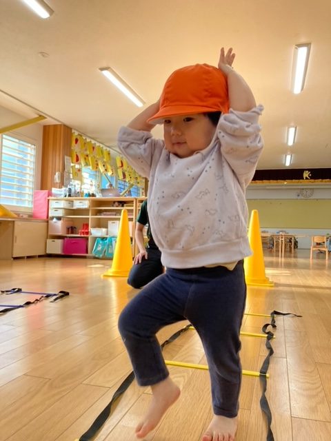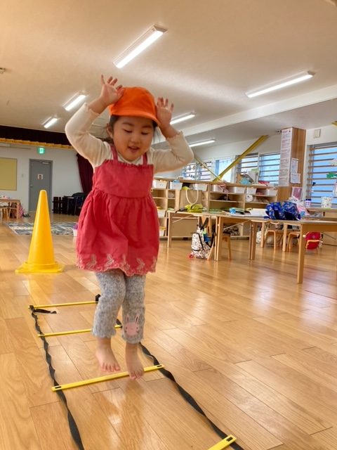 カラーコーンにタッチをして、スタート&ゴールに走って戻ってくる運動からはじめ、ラダーを使って走ったり、うさぎ跳びで、カラー線を踏まないように跳んだりと、先生の笛の合図に合わせて元気よく行いました。