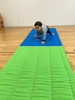 マット運動では転がったり、四つん這いになって進む動きをしましたよ。