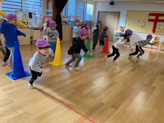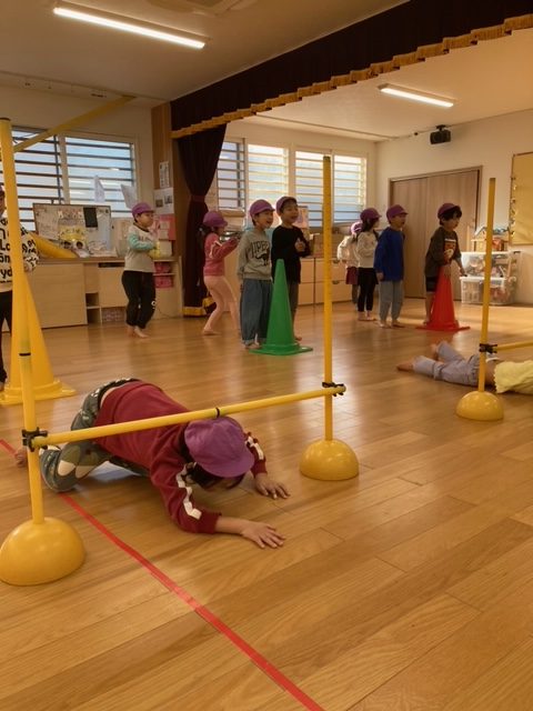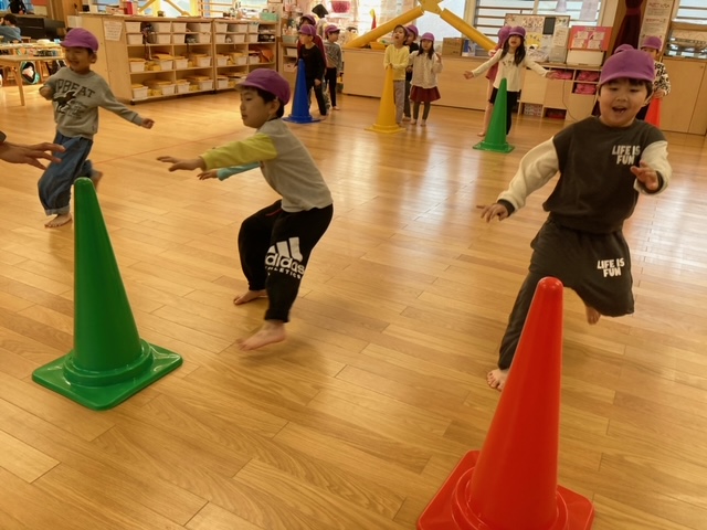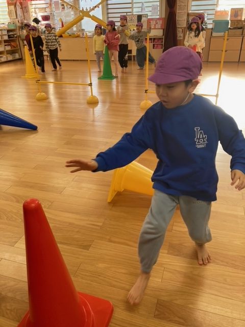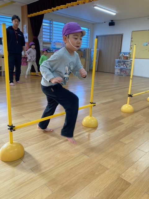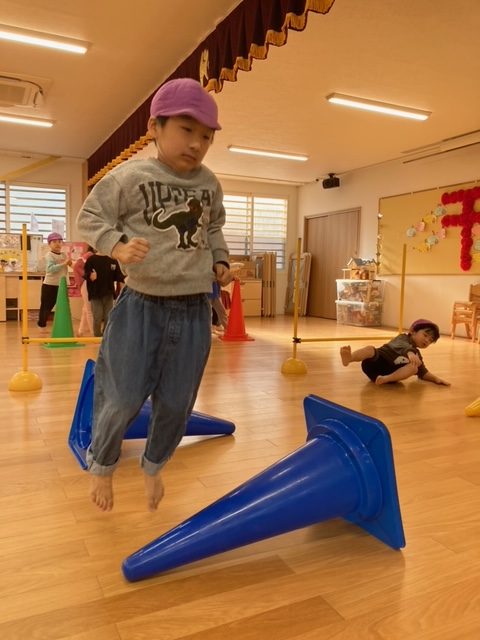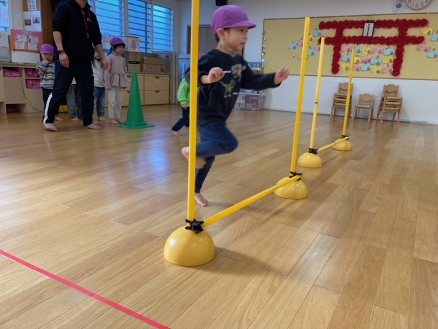 倒れているコーンを超える時に足がバラバラになる事があり、「両足で跳ぶ事を意識して、もう一度」とやり直しをされましたが、一度注意を受けてからは、みんなパーフェクトに超える事が出来ました。