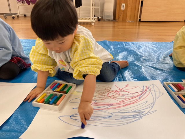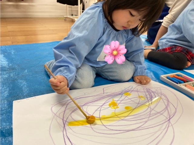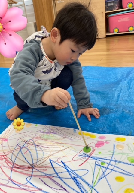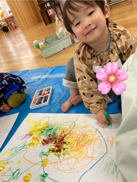 今日のテーマは”大きな画用紙に、春色のクレヨンで伸び伸びと描こう””絵の具で春風をイメージして塗ろう”でした。