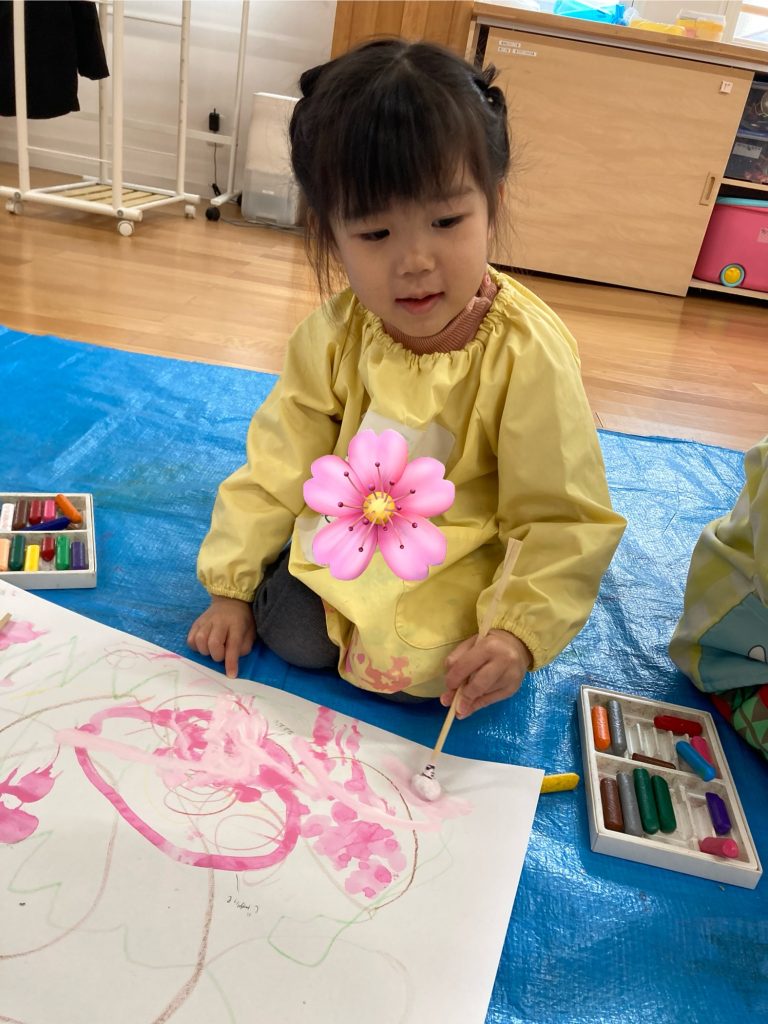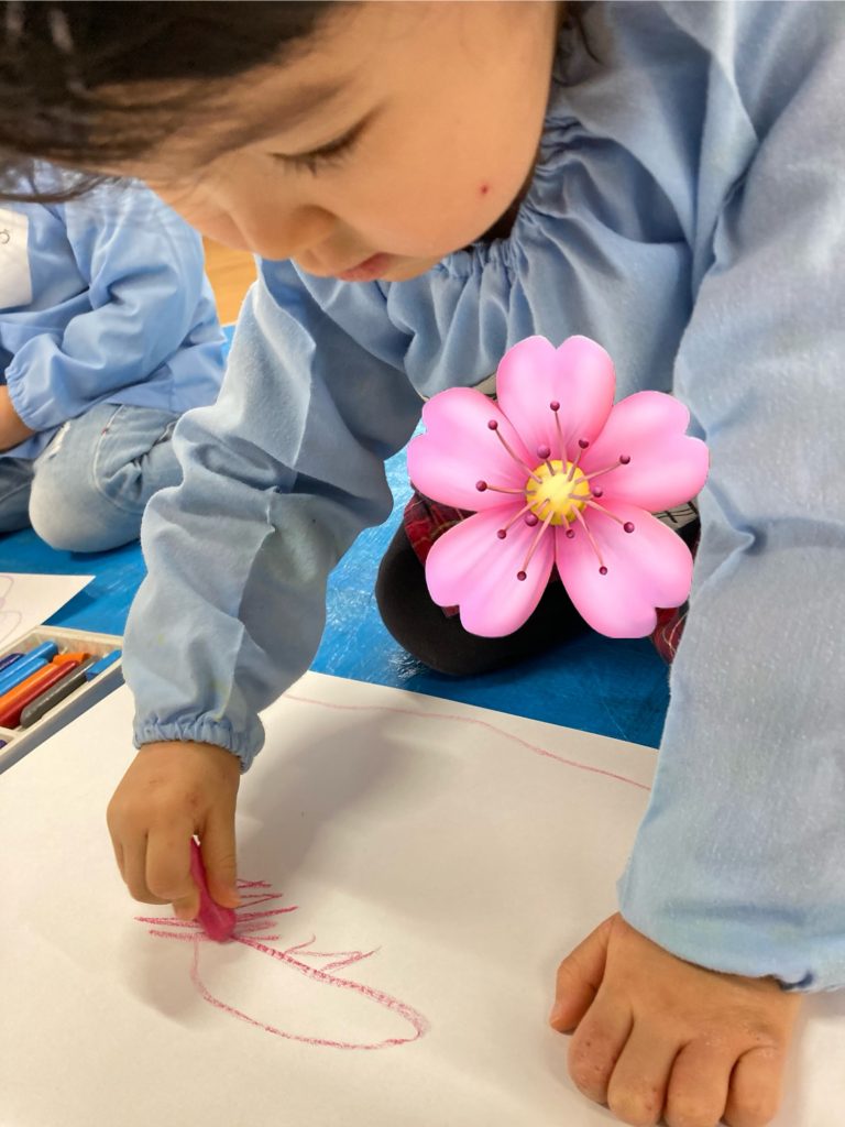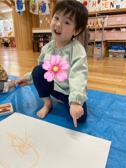 「そよそよ〜」「桜さんだよー」「あったかい風さんだよ」と口にしながら楽しく描く姿が、可愛いらしいもも組さんでした。