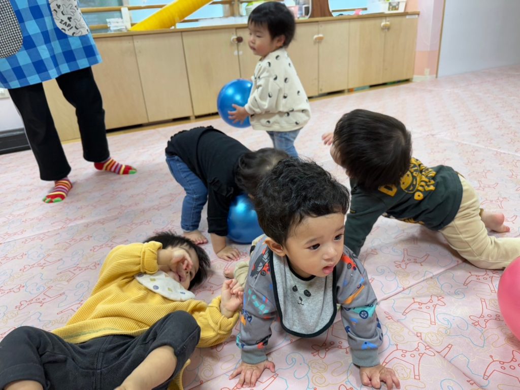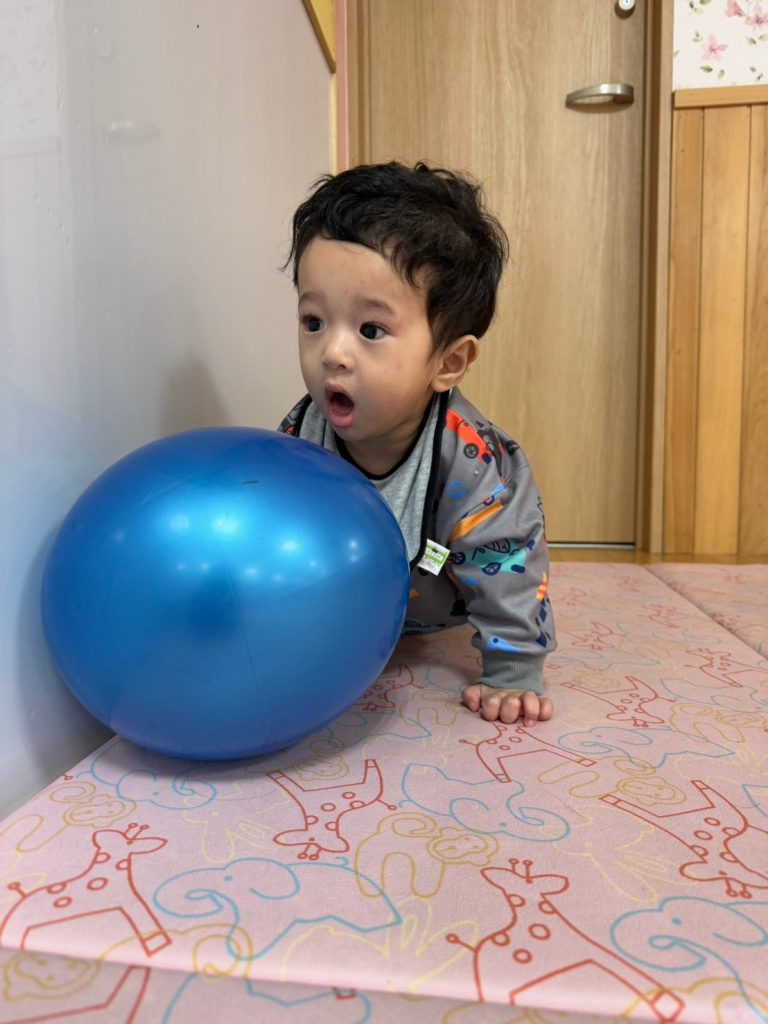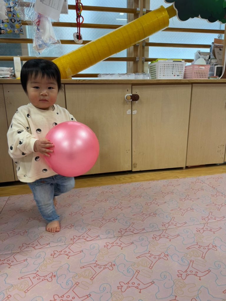 ボールを転がしたり、投げたりしながら楽しく遊んでいた子ども達、名前を呼ばれると保育者のところへ来て座り、手形をとりました。