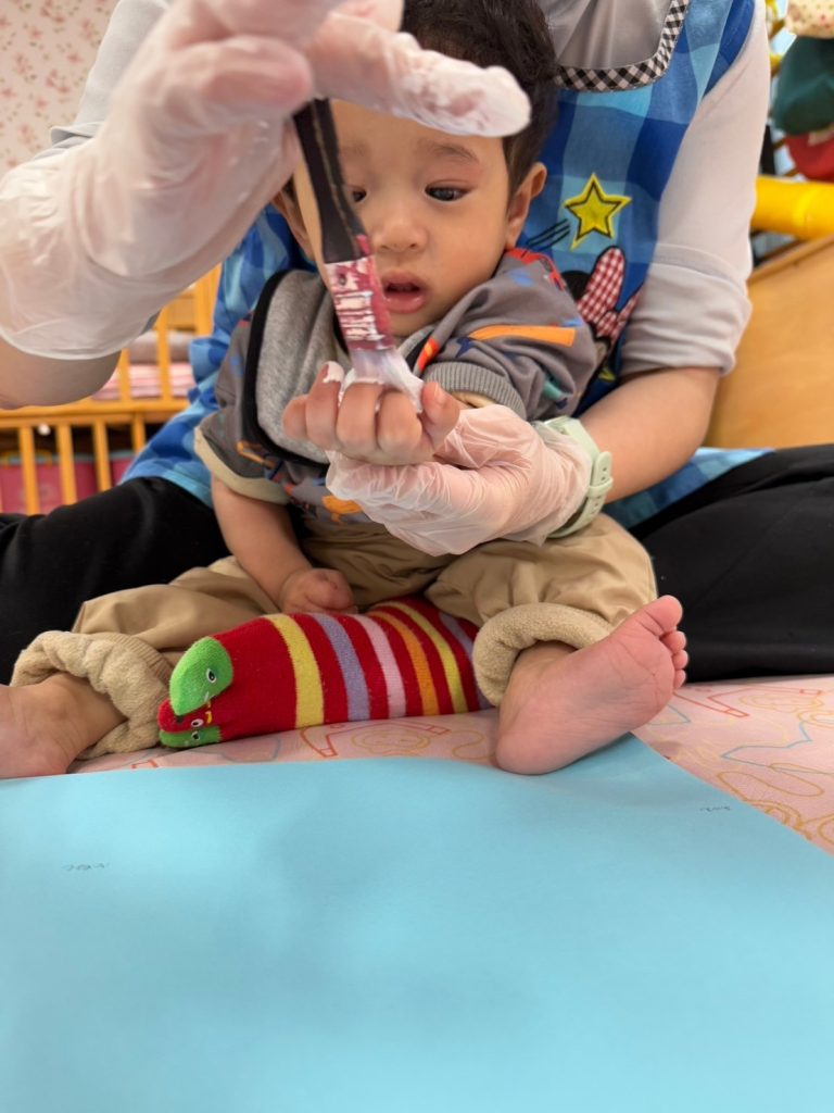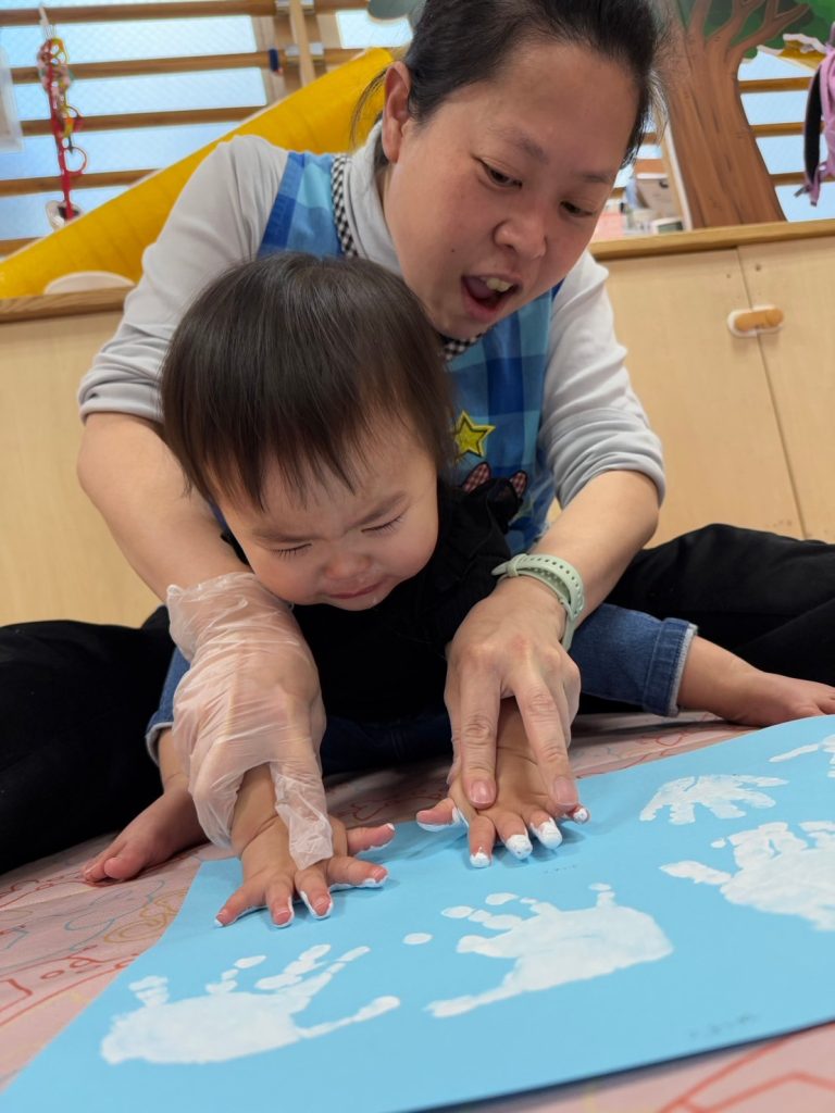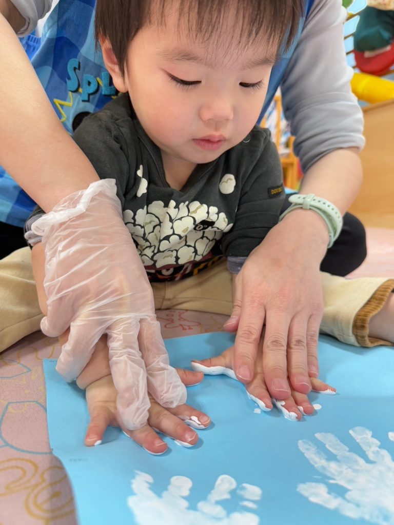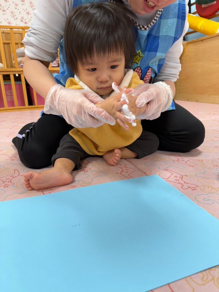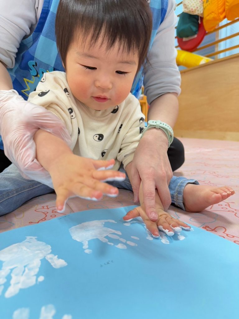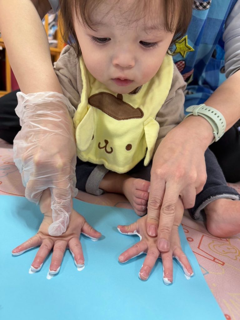 筆を使って掌に絵の具を塗るとくすぐったいのか、じーっと見つめながらも不思議そうな表情。なかなか手をパーにできないお友達もいましたが無事にとることが出来ました。
