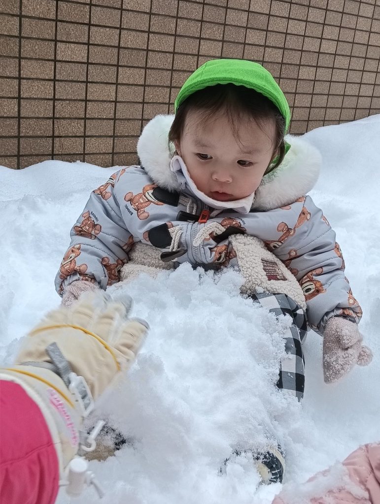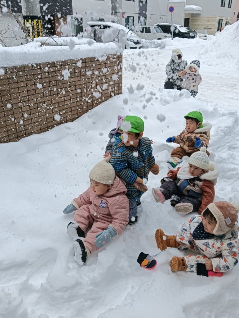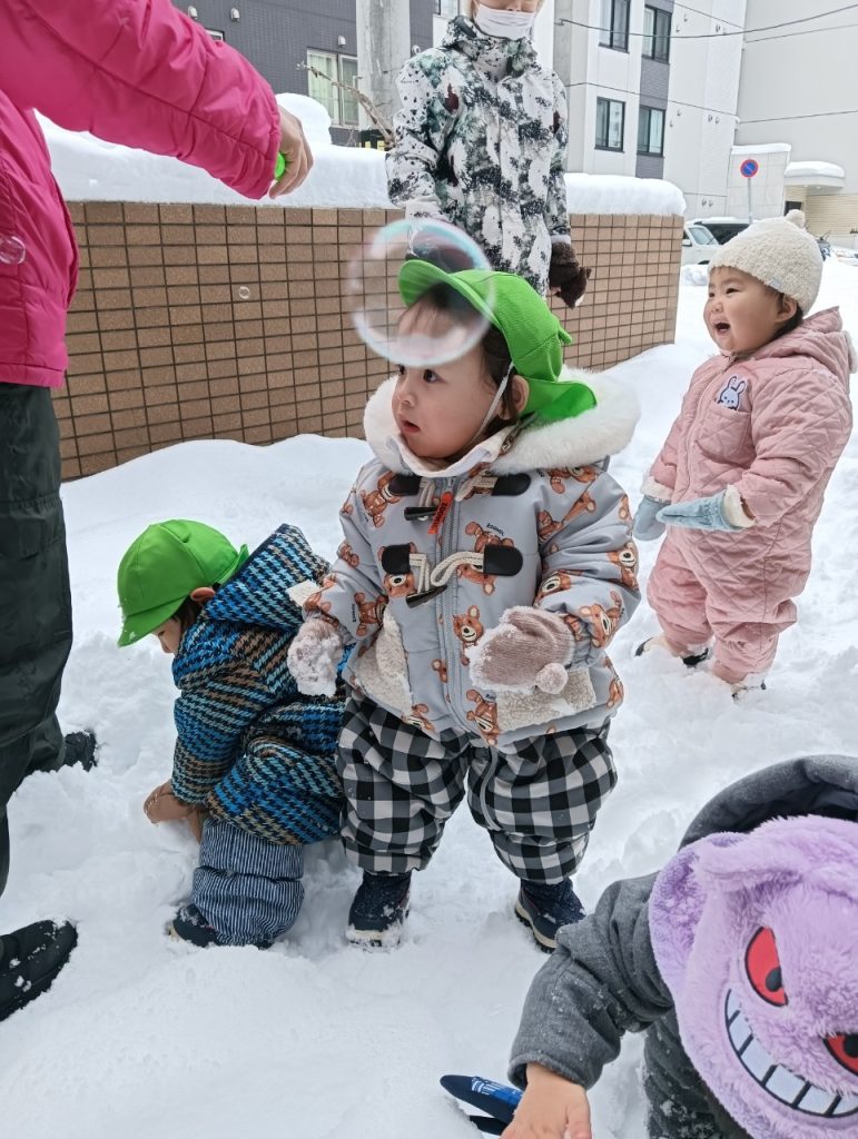 保育者が雪を上に放り投げて舞わせると顔に雪がかかるのを嫌がることなくにこにこ笑顔の子ども達。自ら雪に触れてみたり、保育者が作った雪玉に触れて楽しんでいました。