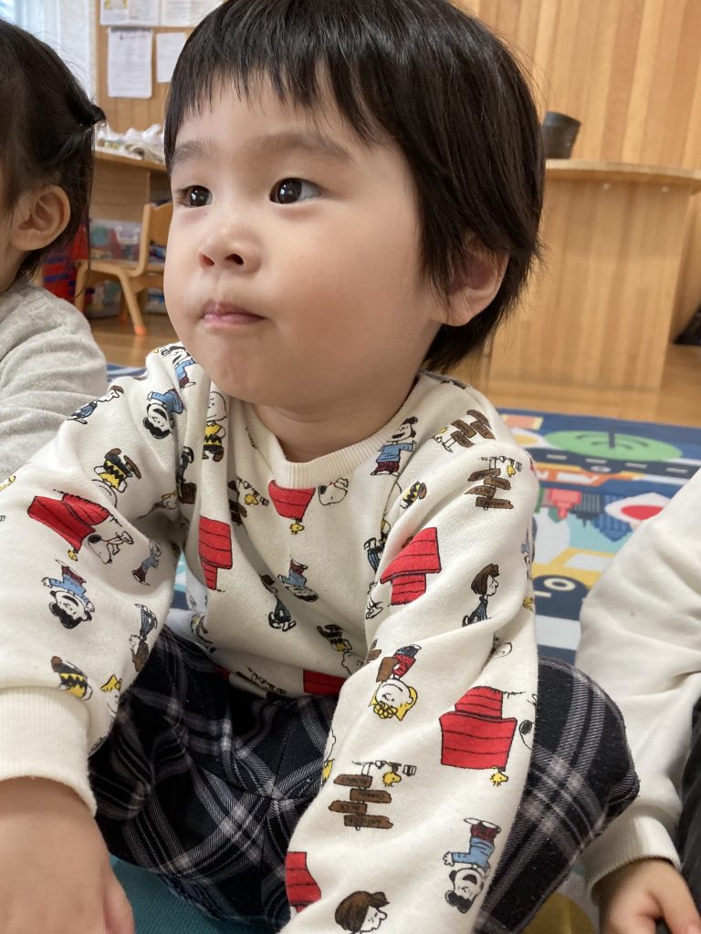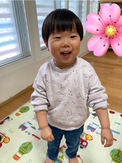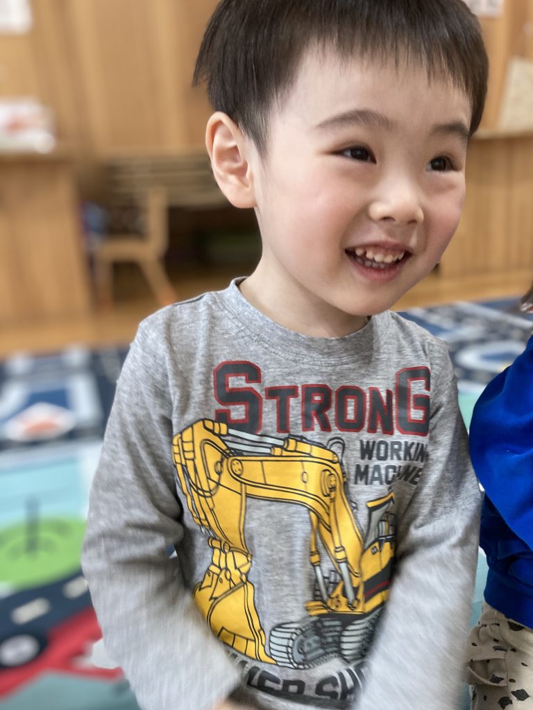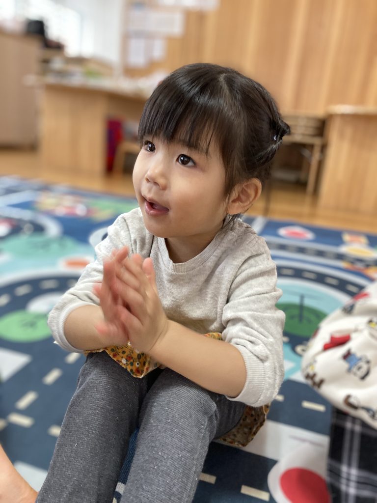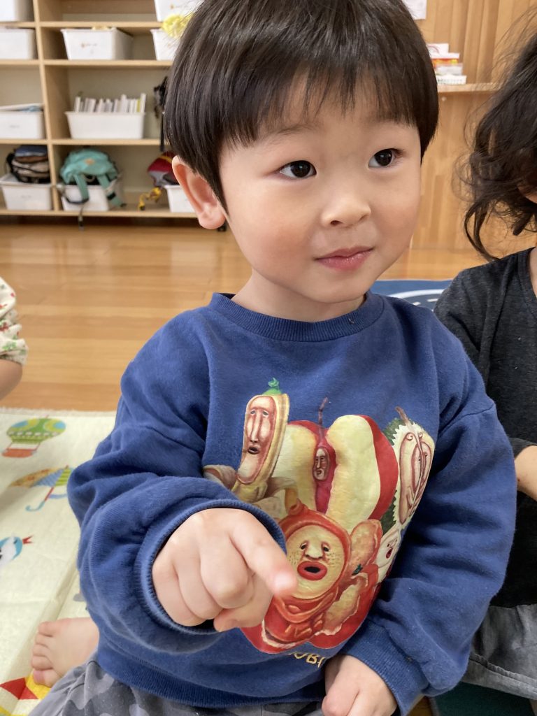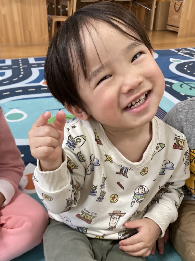 歌をうたったり体を動かして、元気いっぱいの声と笑顔が溢れていました。また、真剣な表情で繰り返し発音する姿もあり、表情豊かに楽しんでいたもも組さんです。