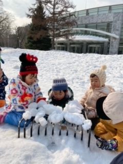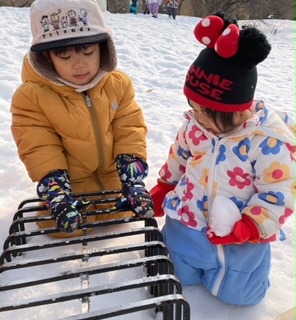 また、公園にあった網のような所に雪の塊を並べて、バーベキューごっこをしていました。