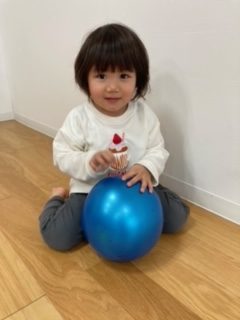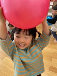 「ボール遊び」では、ボールを投げたり、蹴ったり、お腹の中に入れたりと全身で楽しんだもも組さんでした。