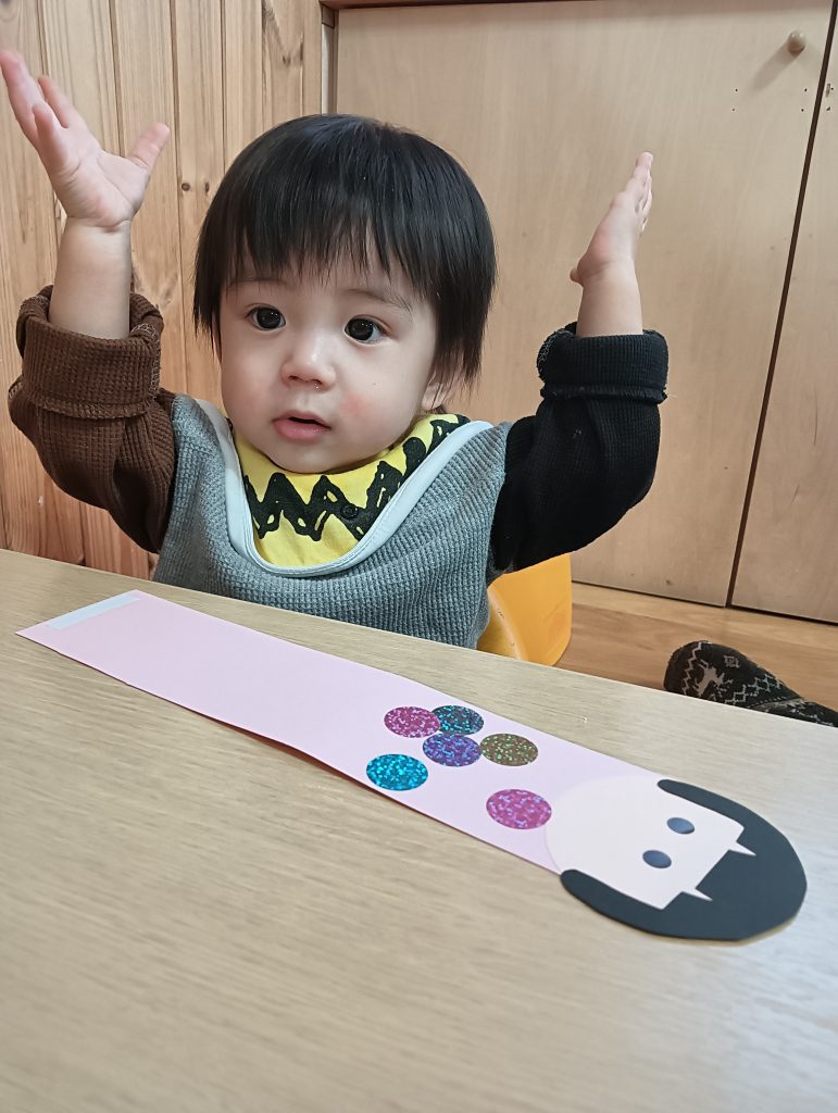 保育者に「上手に貼れたね」と言われてにこにこ笑顔の子ども達です。