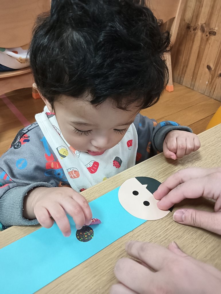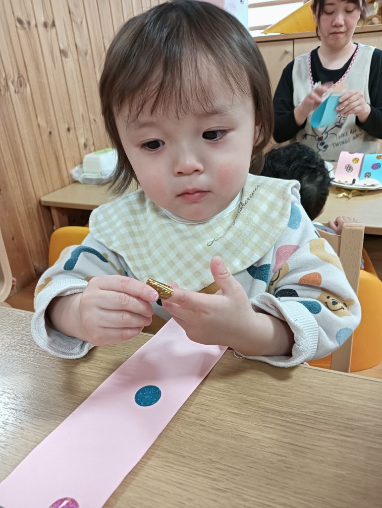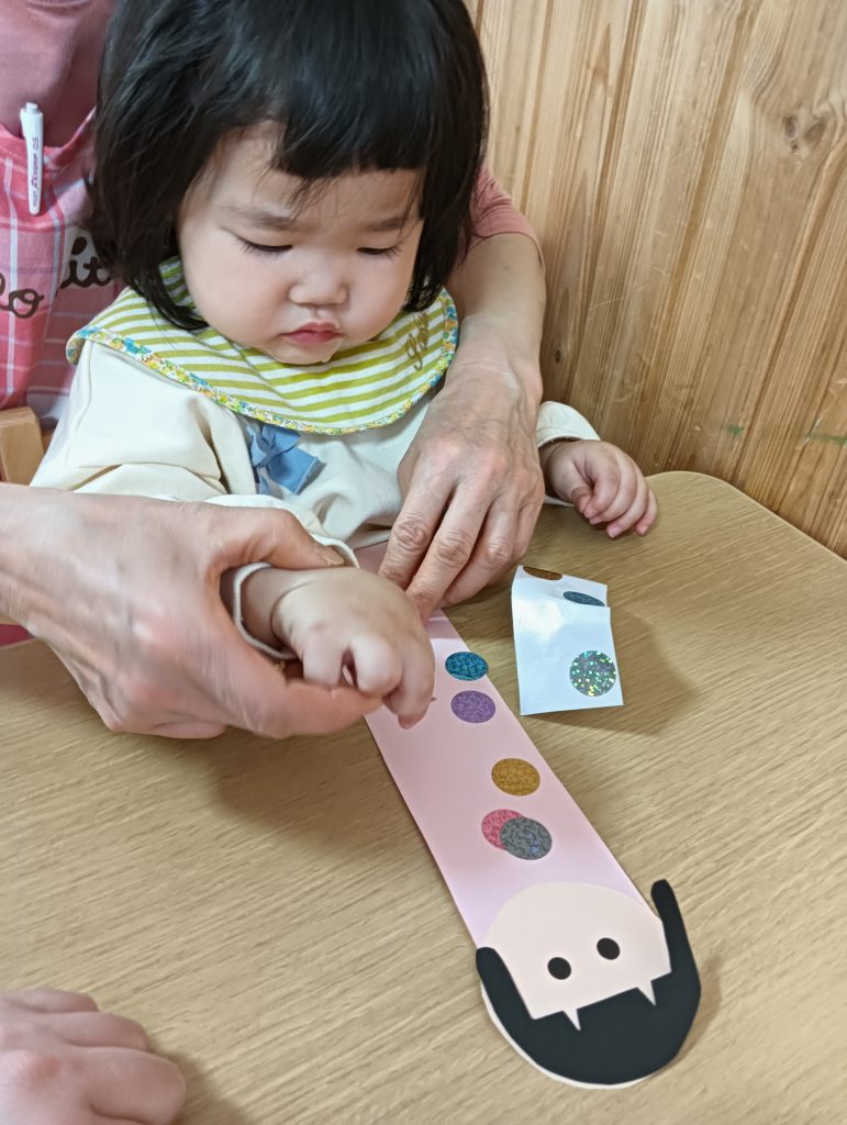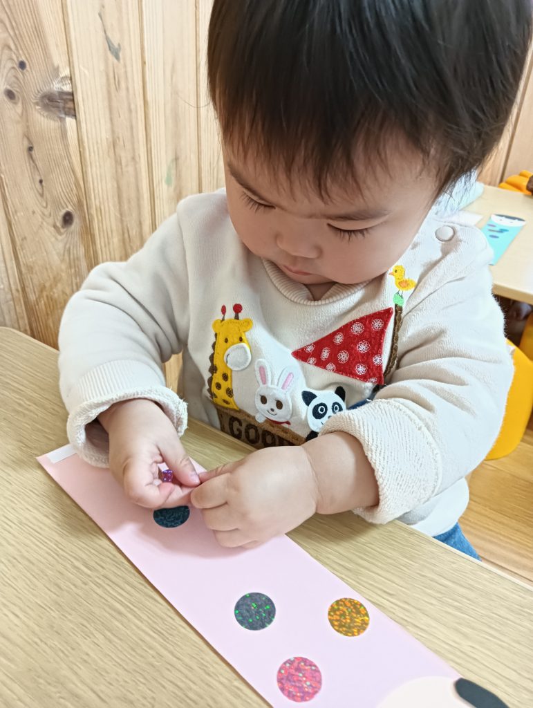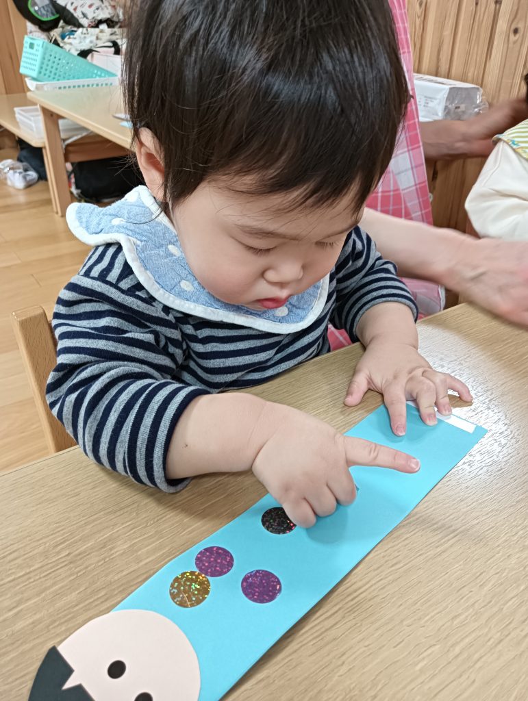 少しずつ手先が器用になってきて、自分で台紙からシールを剥がして貼る姿が見られるようになってきました。
