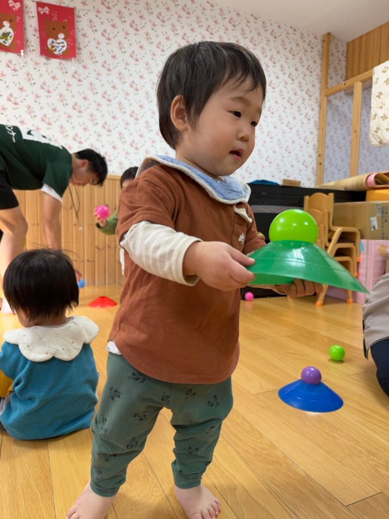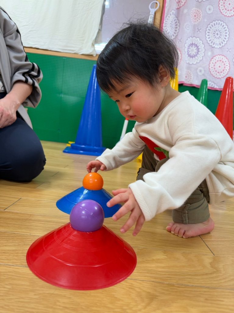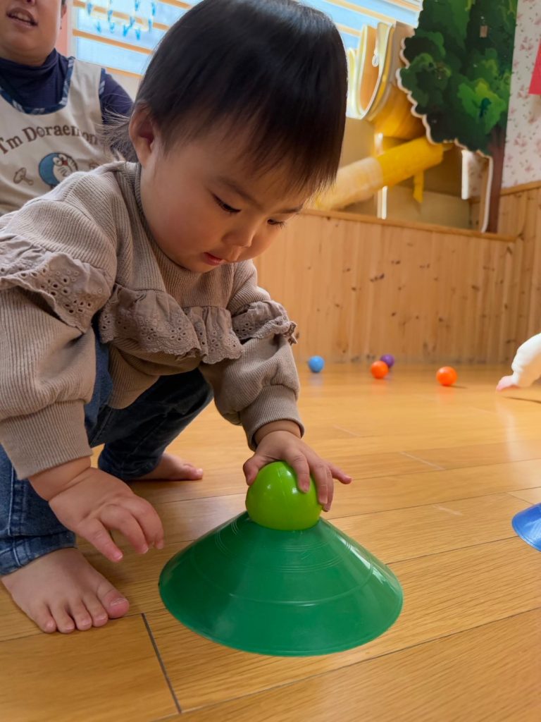 次はカラーボールと穴が空いているコーンを使って、ボールを拾ってコーンの上に置く動作をしました。講師のスタートの合図がでる前から行うほど楽しんでいました。