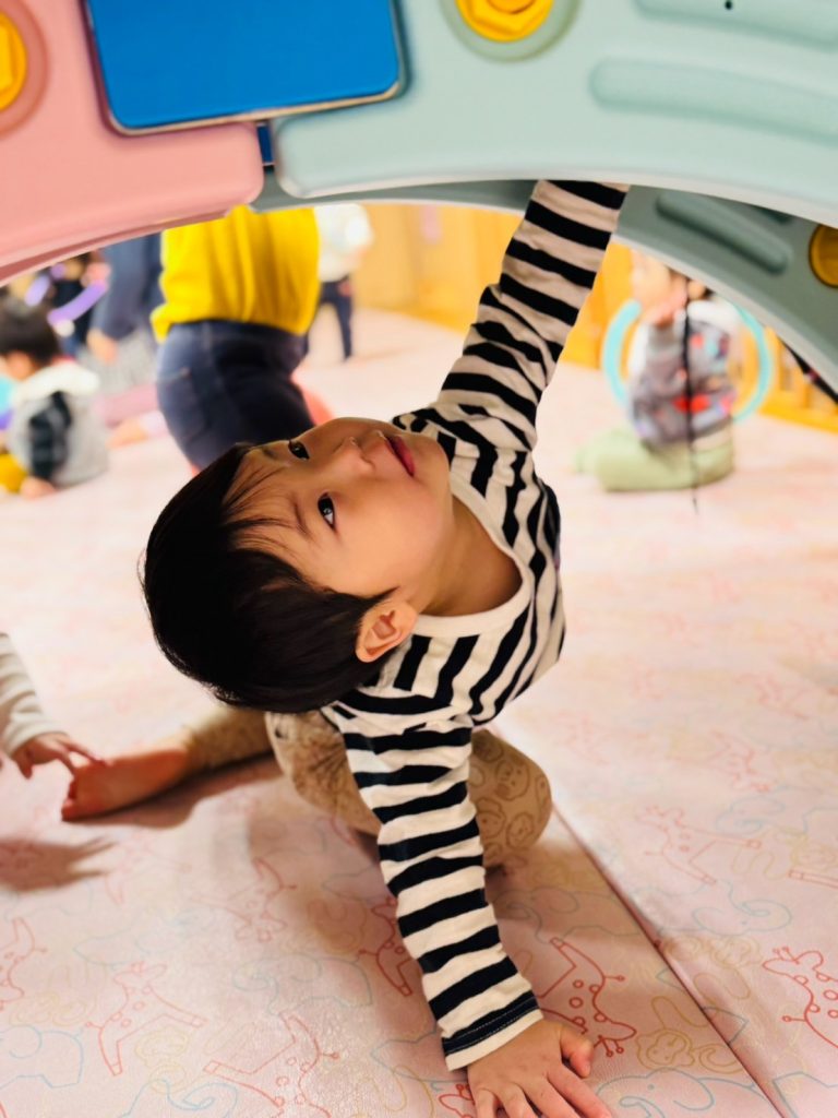 アーチ型の平均台をトンネルのようにしてくぐったり