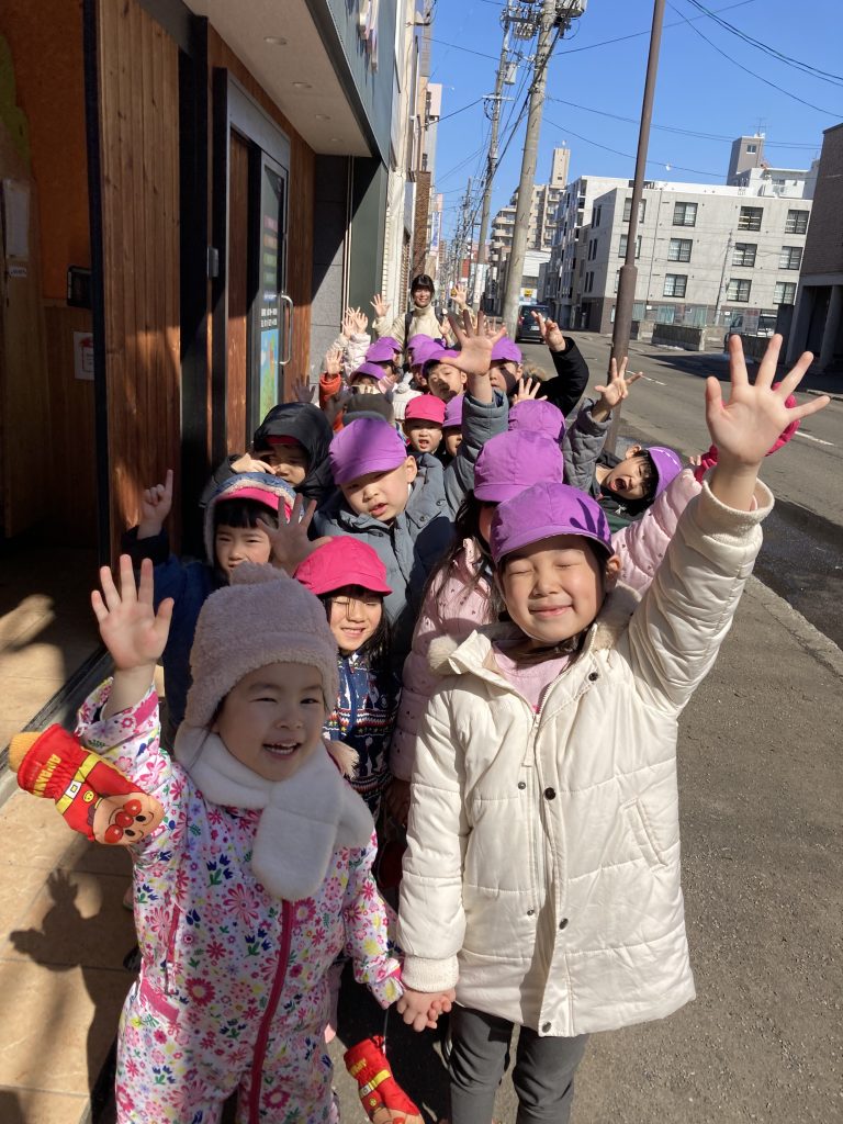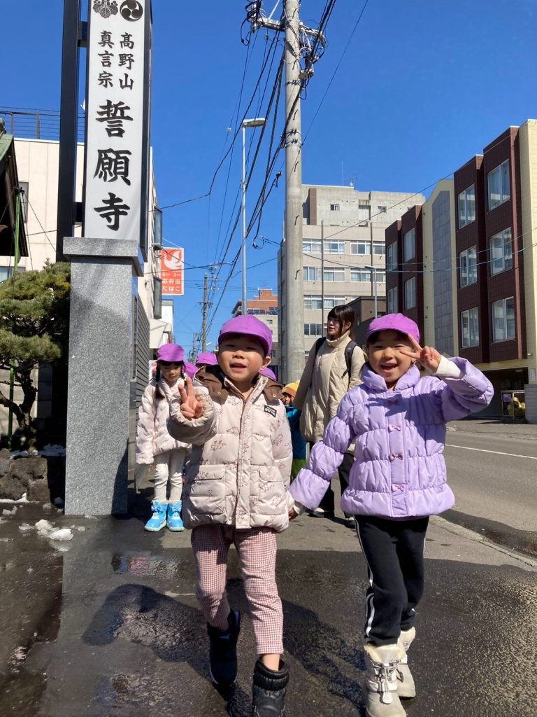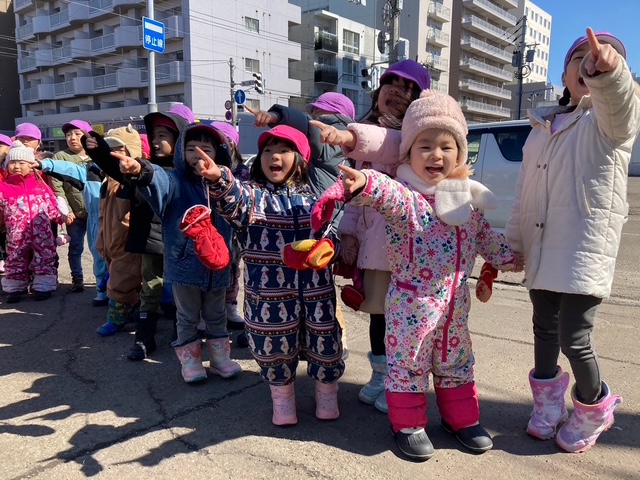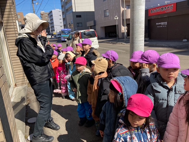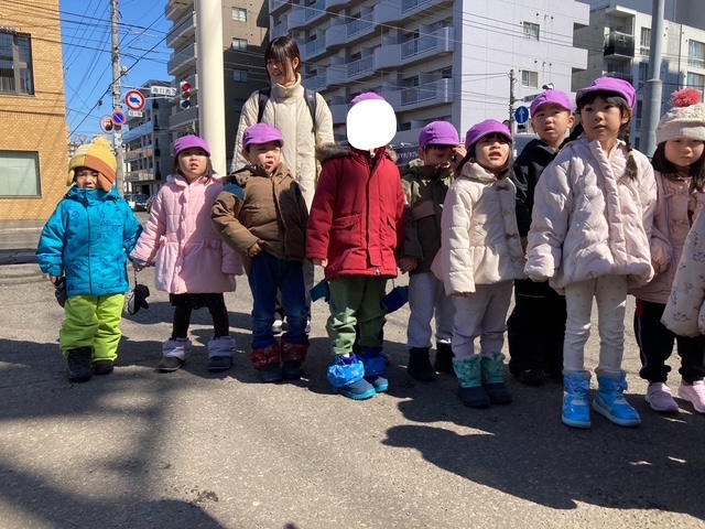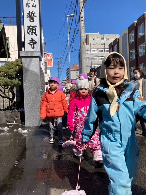 歩道の雪もほとんど溶け、うめ組さくら組はお散歩に行きました