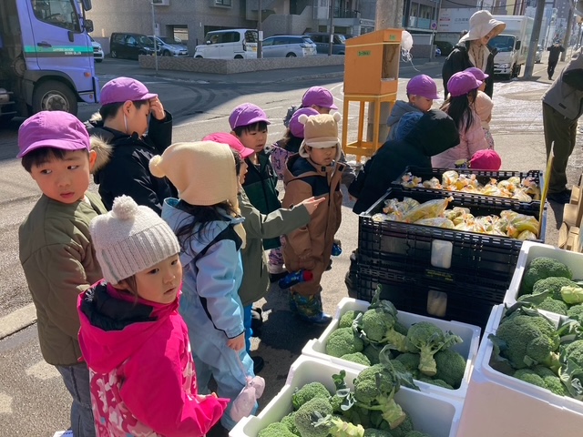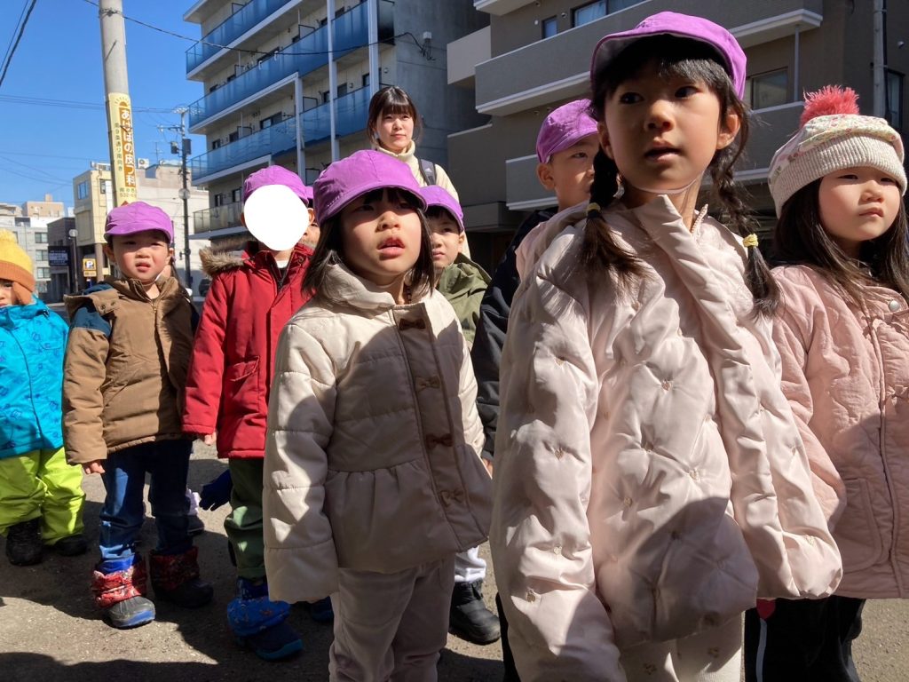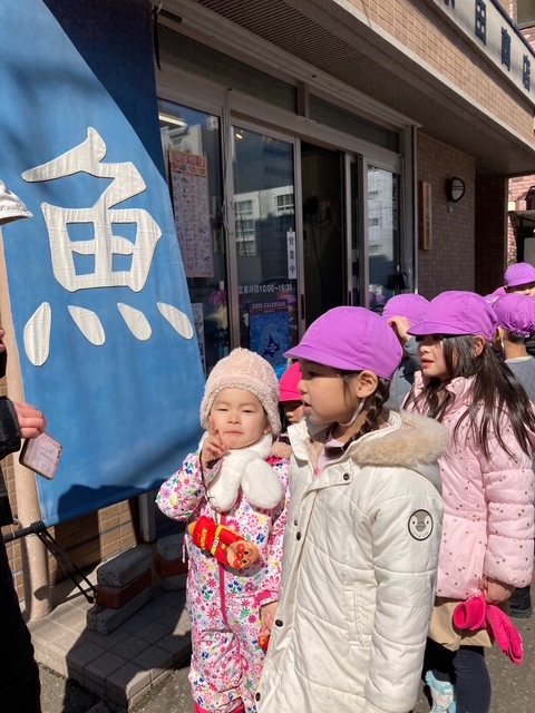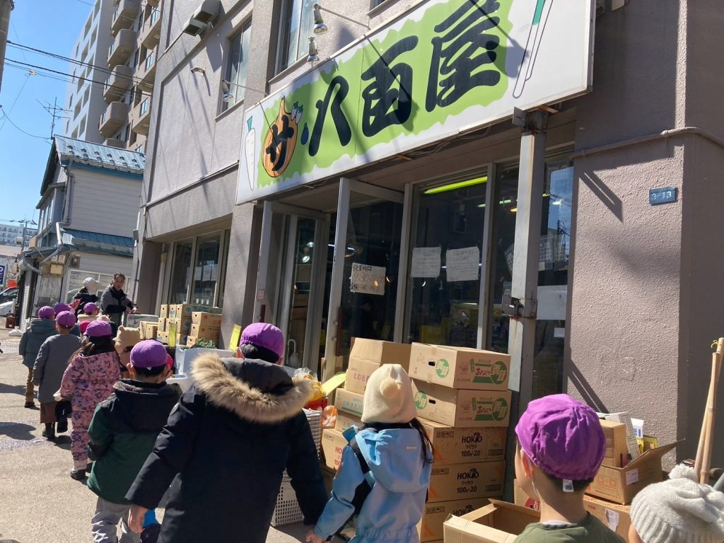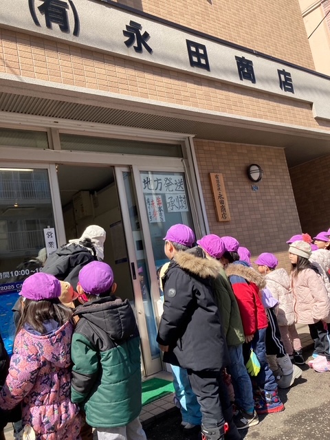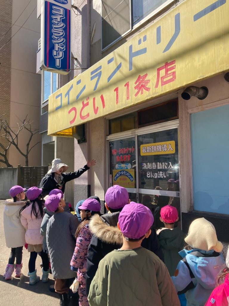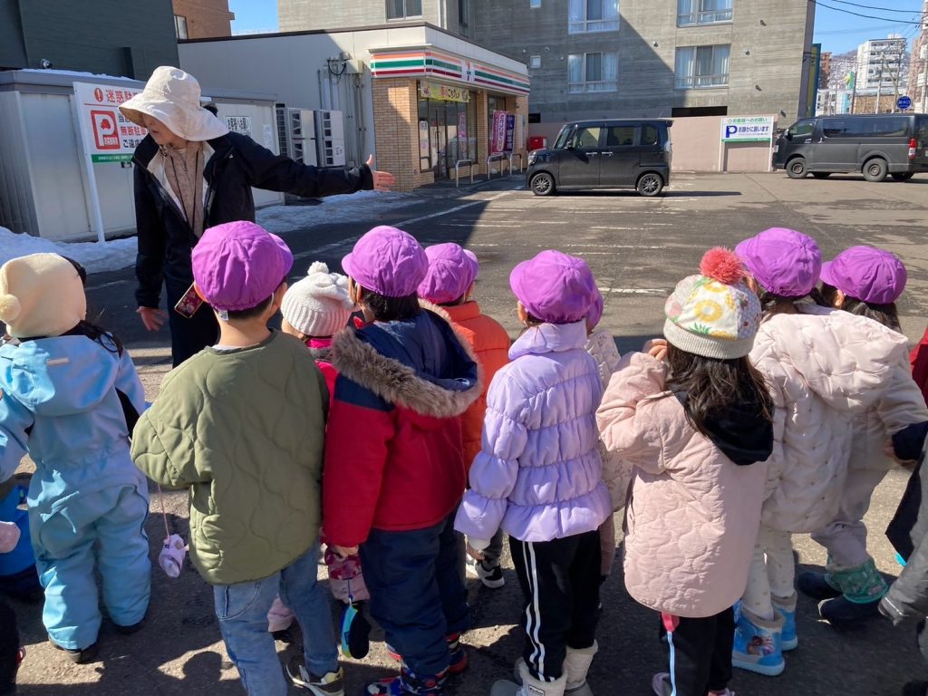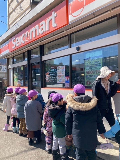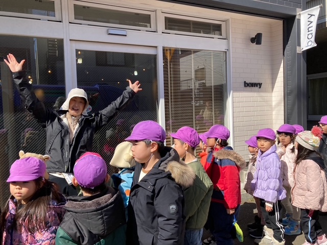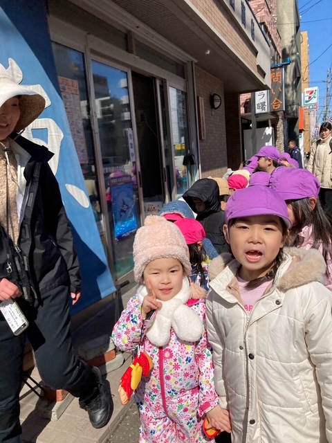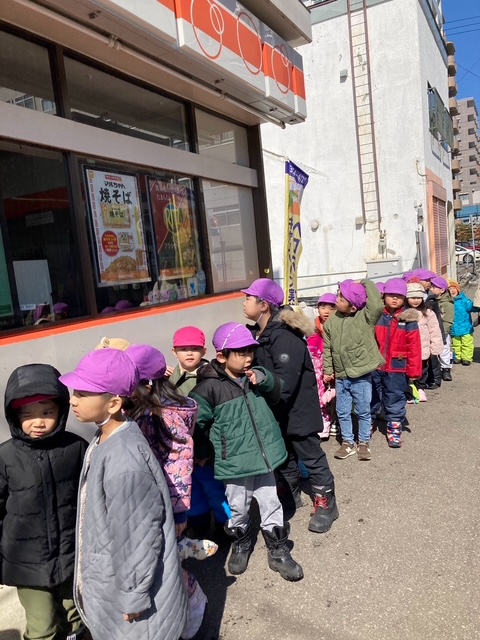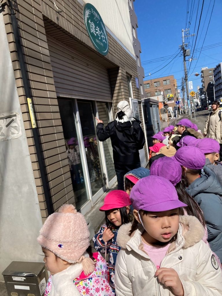 お店があると、みんなでお店の前で止まり、どんなお店なのか確認し、保育者が説明しながら街を探索しました