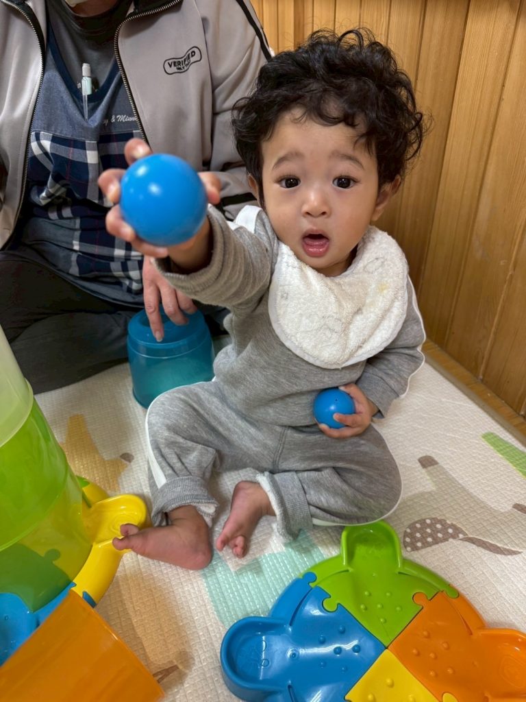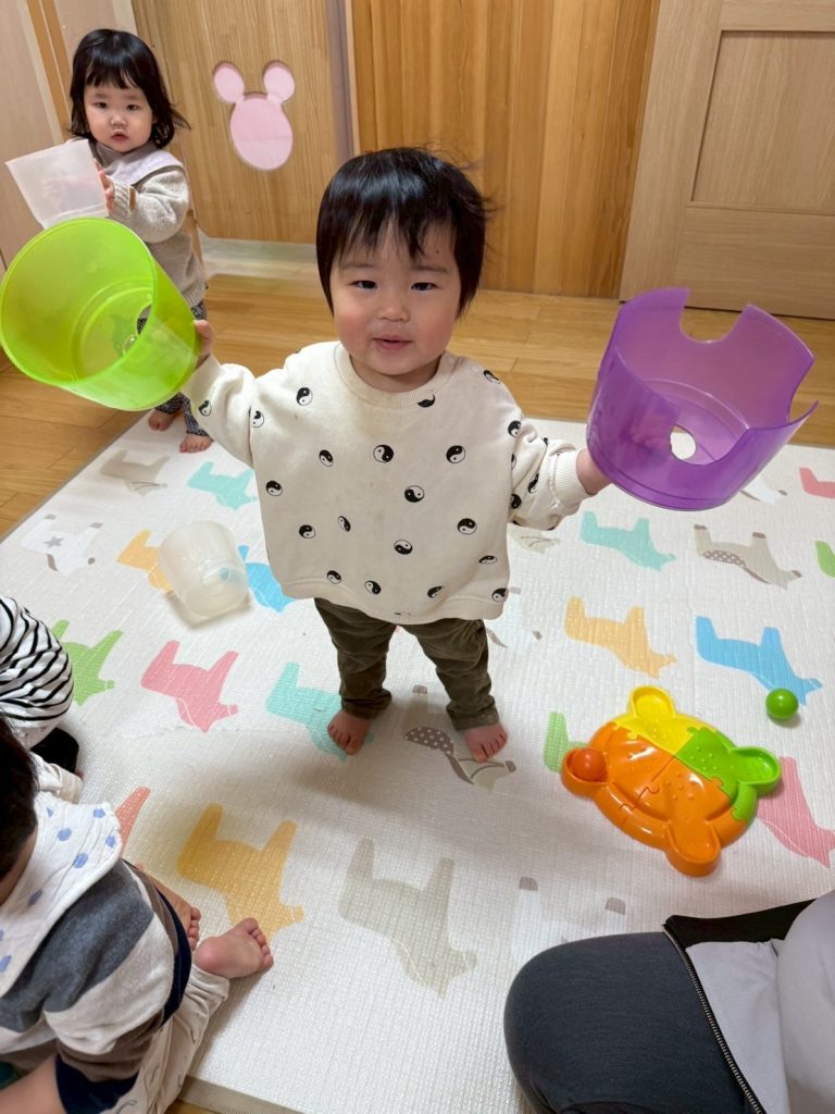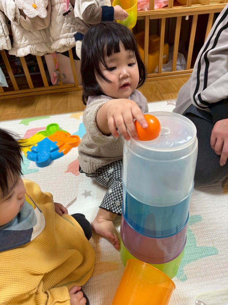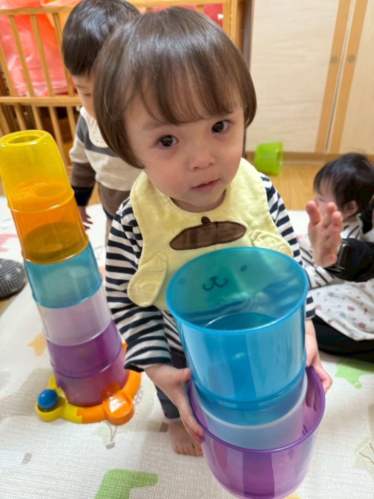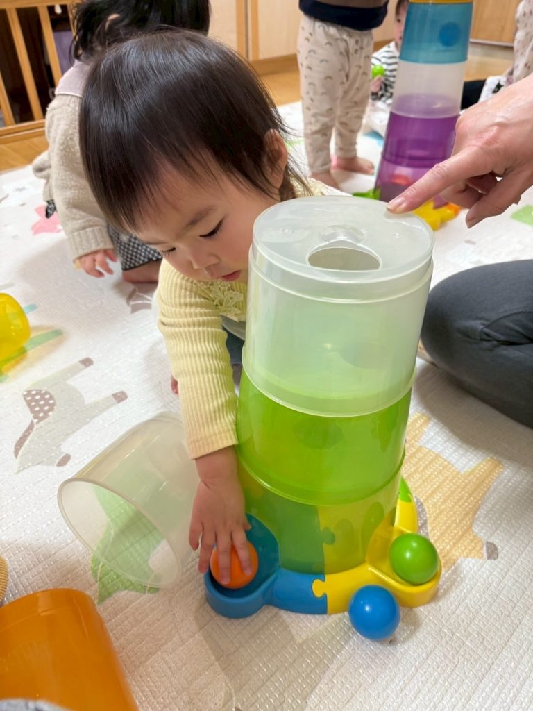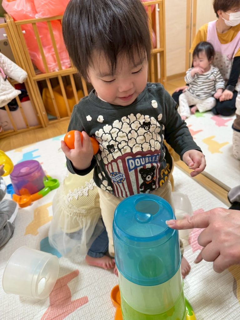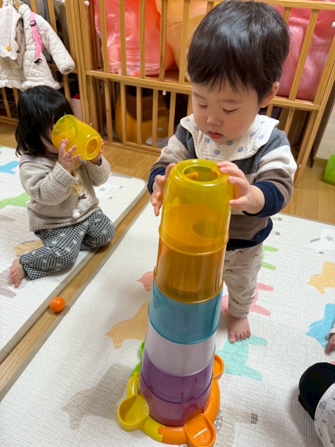 2025年03月27日(木) 3月27日 さくらんぼ組 今日はコロコロタワーで遊びました。上手にカップを重ねたり、ボールを転がせるようになったさくらんぼ組さん。 ボールが転がっていくのをニコニコ笑って楽しそうに見ていましたよ。