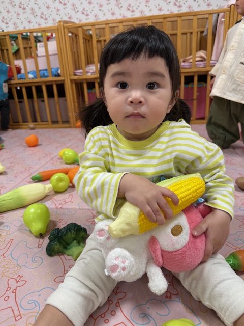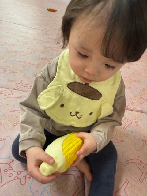 人形に野菜を食べさせるお友達や、保育者に野菜をくれるお友達もいました。
