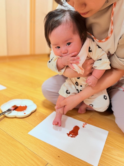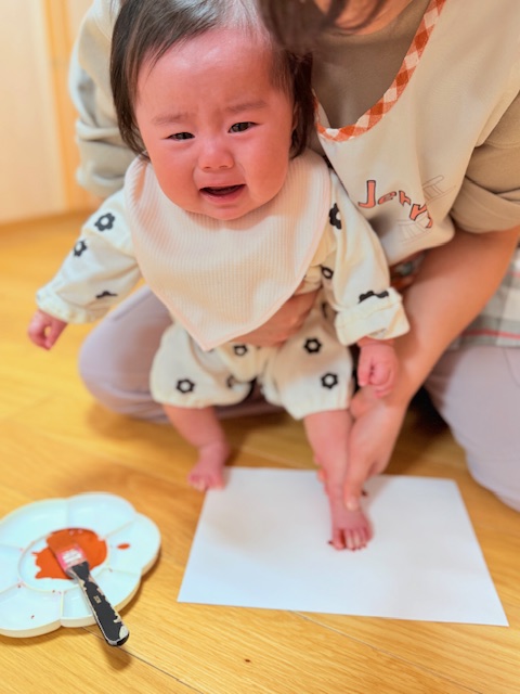 絵の具を手や足に塗る感触にびっくりしてしまう子もいましたが、最後までやり切ってくれました。