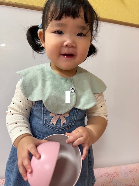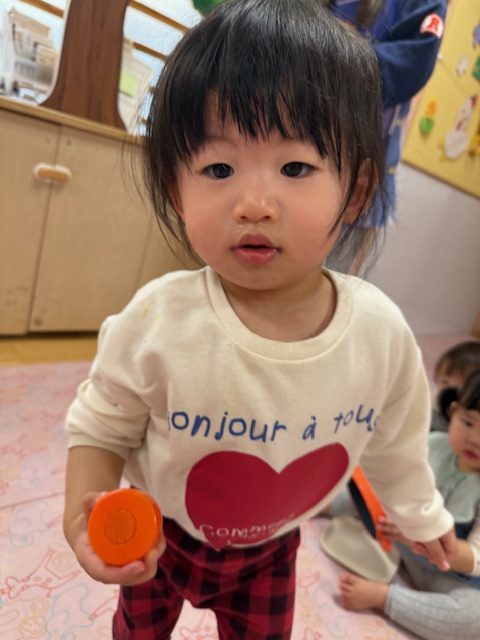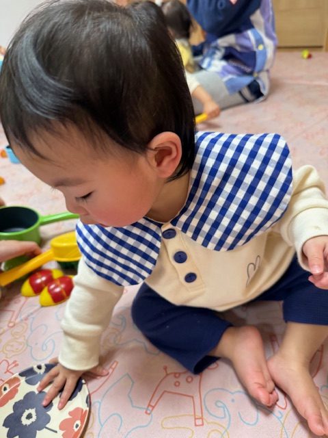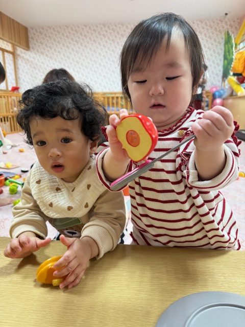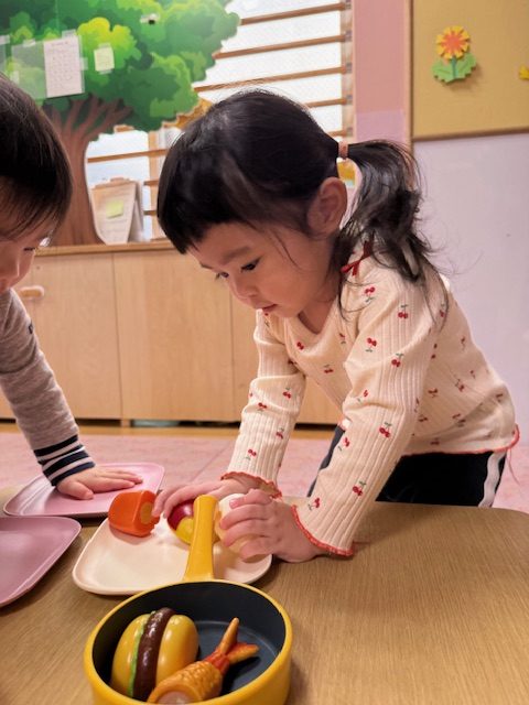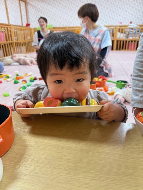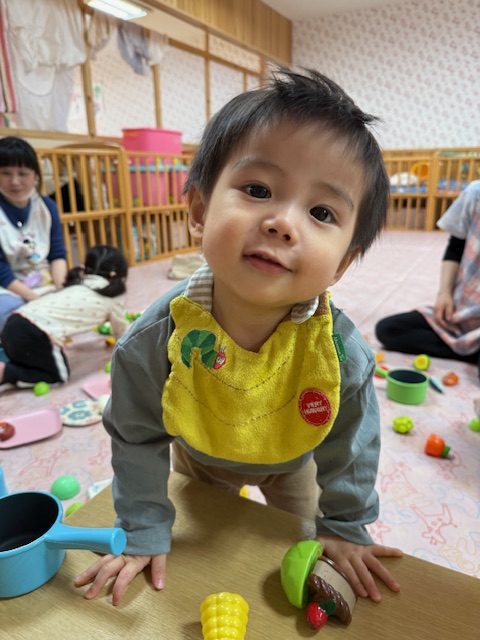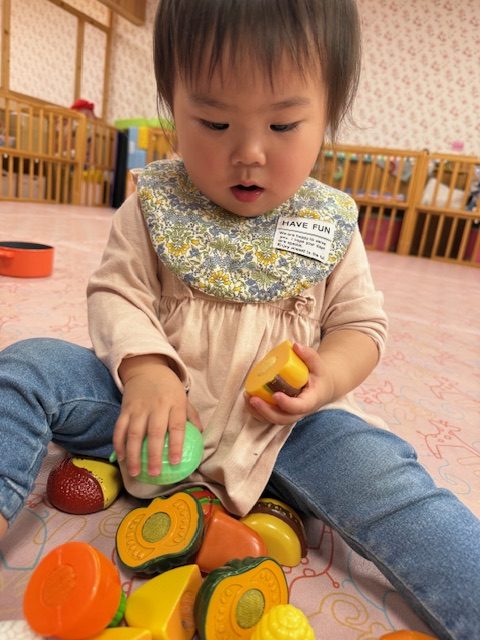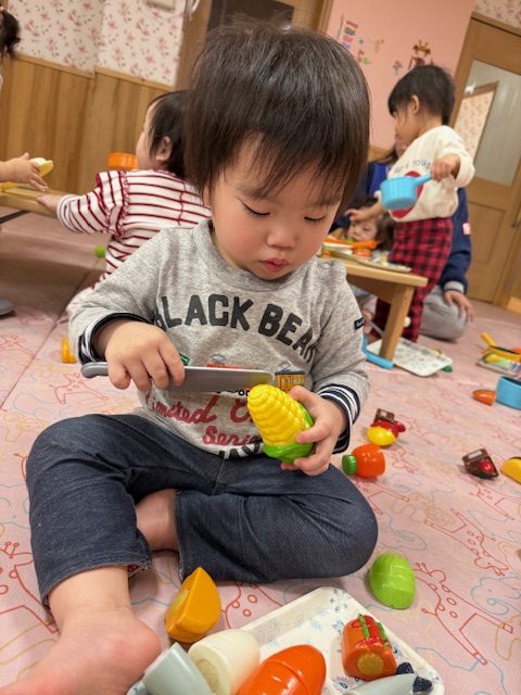2025年04月09日(水) 4月9日 さくらんぼ組・いちご組 今日はおままごとをしました。さくらんぼ組さんは野菜や食べ物を眺めて舐めてみたり、鍋に野菜を入れたりしていました。いちご組さんは少しずつおままごとが上手になってきていて、鍋に食べ物を入れて料理したり、包丁で食べ物を切ったりしていました。