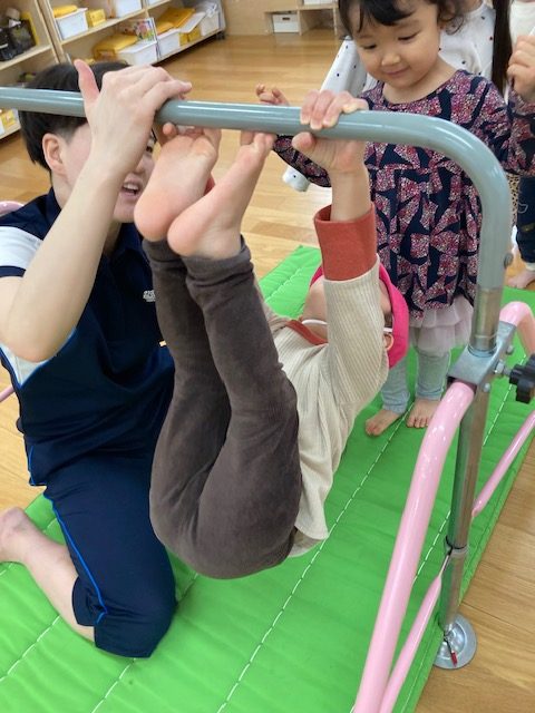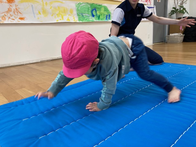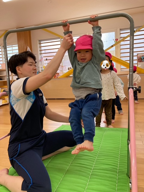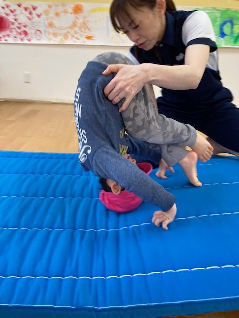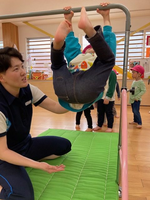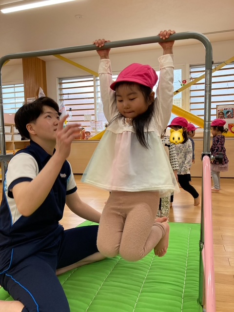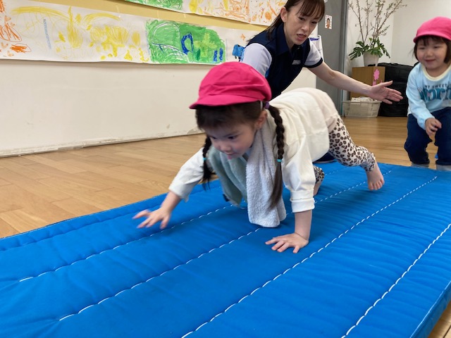 “体育”の活動があり、マット運動や鉄棒に取り組んでいます。