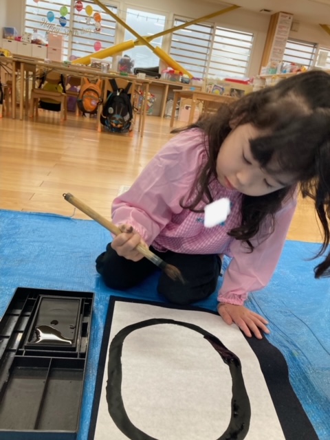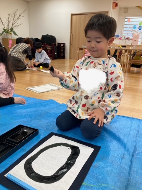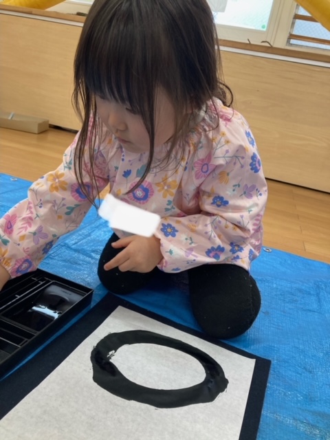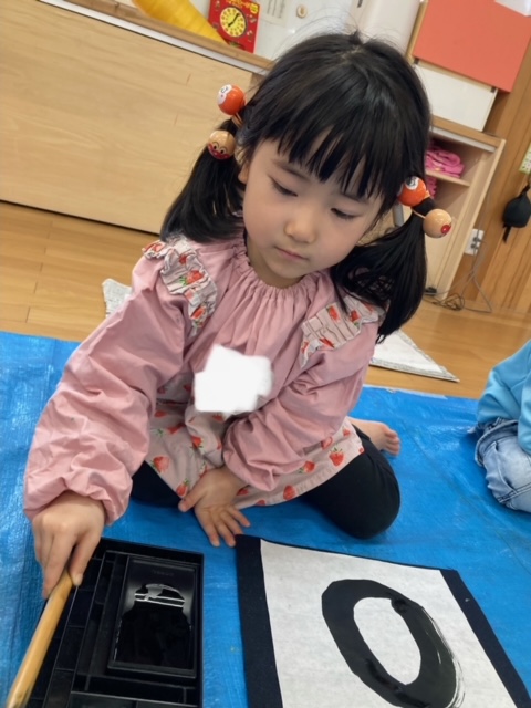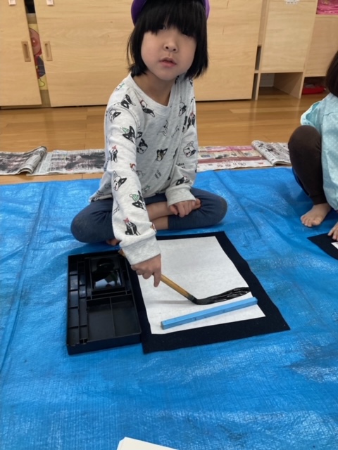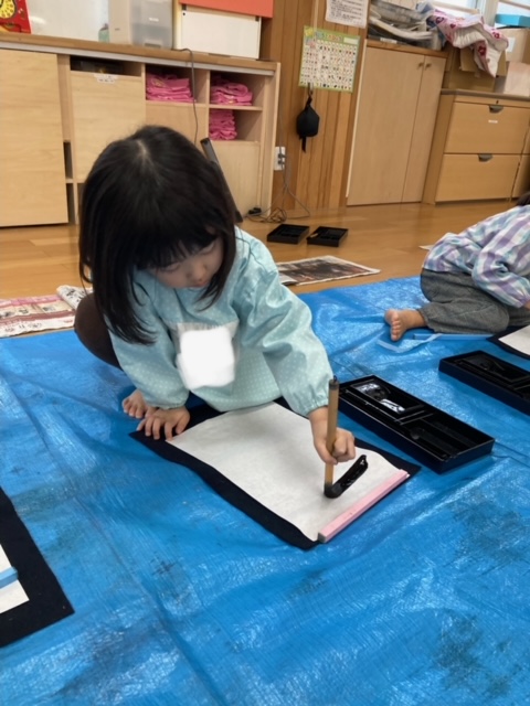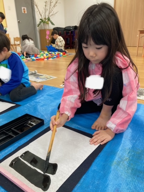 今日は書道をしました。今年度初めての書道で小さいさくら組はドキドキしていました。