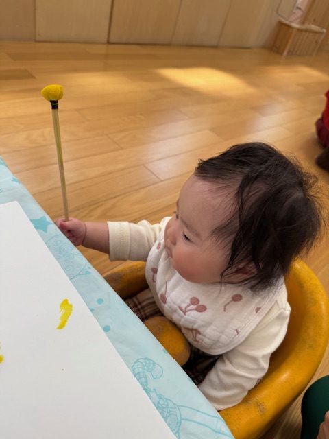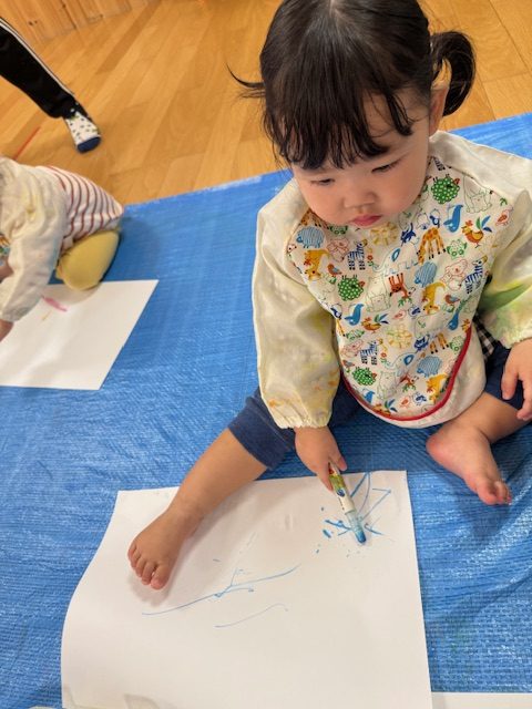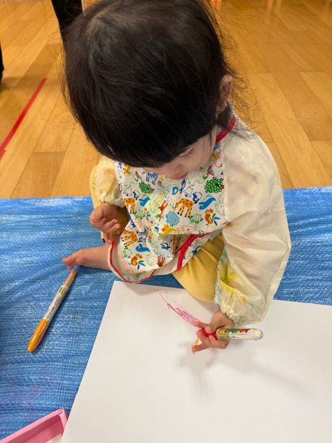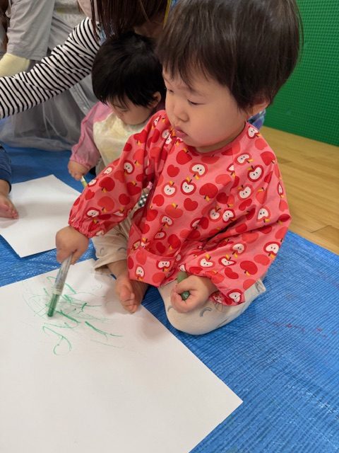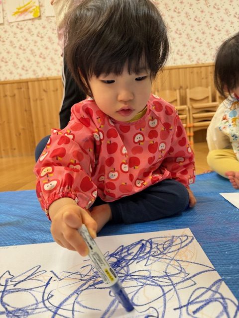 2025年05月01日(木) 5月1日 さくらんぼ組・いちご組 今日は造形表現がありました。今日のテーマは自由画です。クレヨンや絵の具で絵を描いていきました。紙に色をのせることにも慣れてきて、迷いなく描くことが出来ていましたよ。
