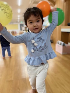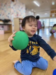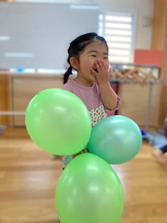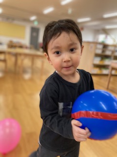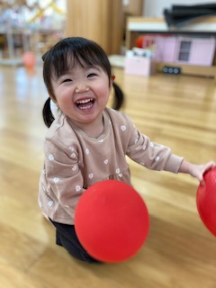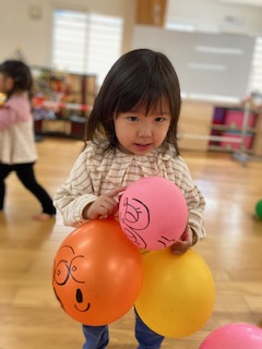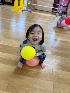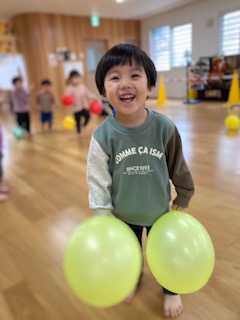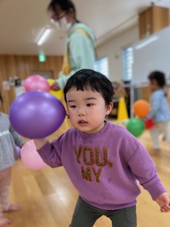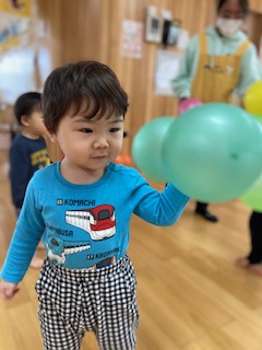 風船をたくさん腕の中に収めようと頑張る子や両手に持って走って風船が揺れる様子を楽しむ子など様々な遊び方をして、楽しむ様子が見られました。