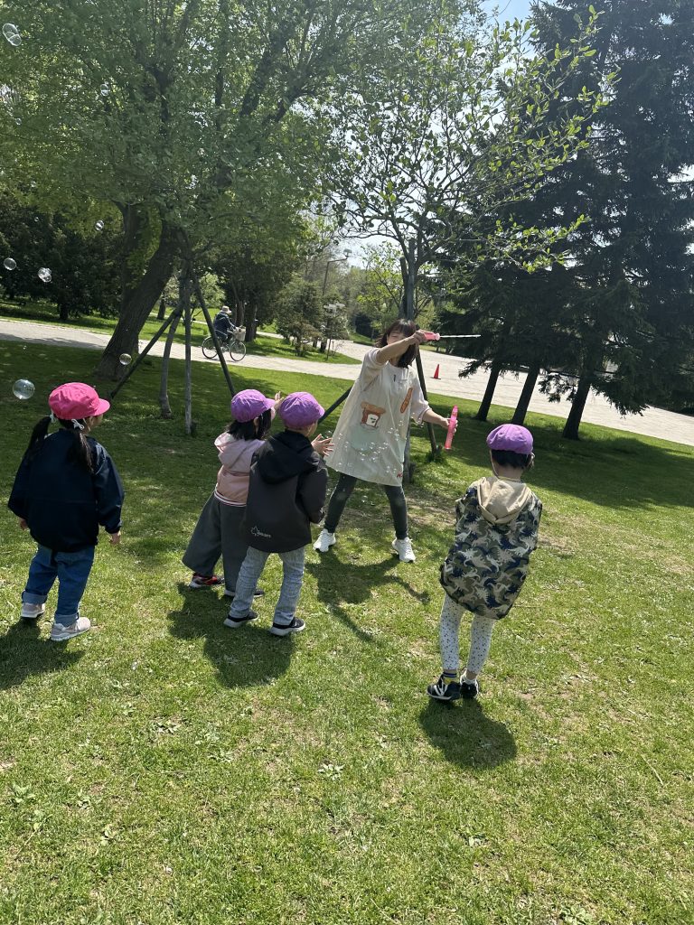 公園内では、シャボン玉や水鉄砲で遊んだ他、お花や木の実・虫などを見つけて観察したり、広場を思い切り走り回り爽やかな汗を流して楽しんできました。