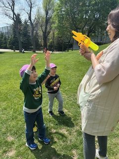 暑くなってきたので、上着を脱いだり水鉄砲の水を浴びて涼んだりしながら体温調節をし、外遊びを楽しみました。