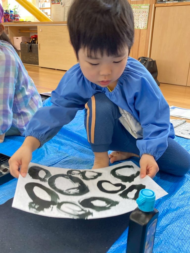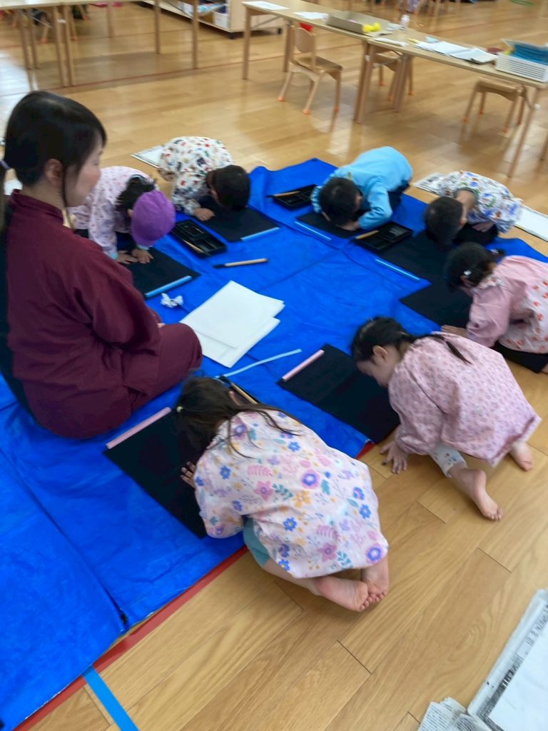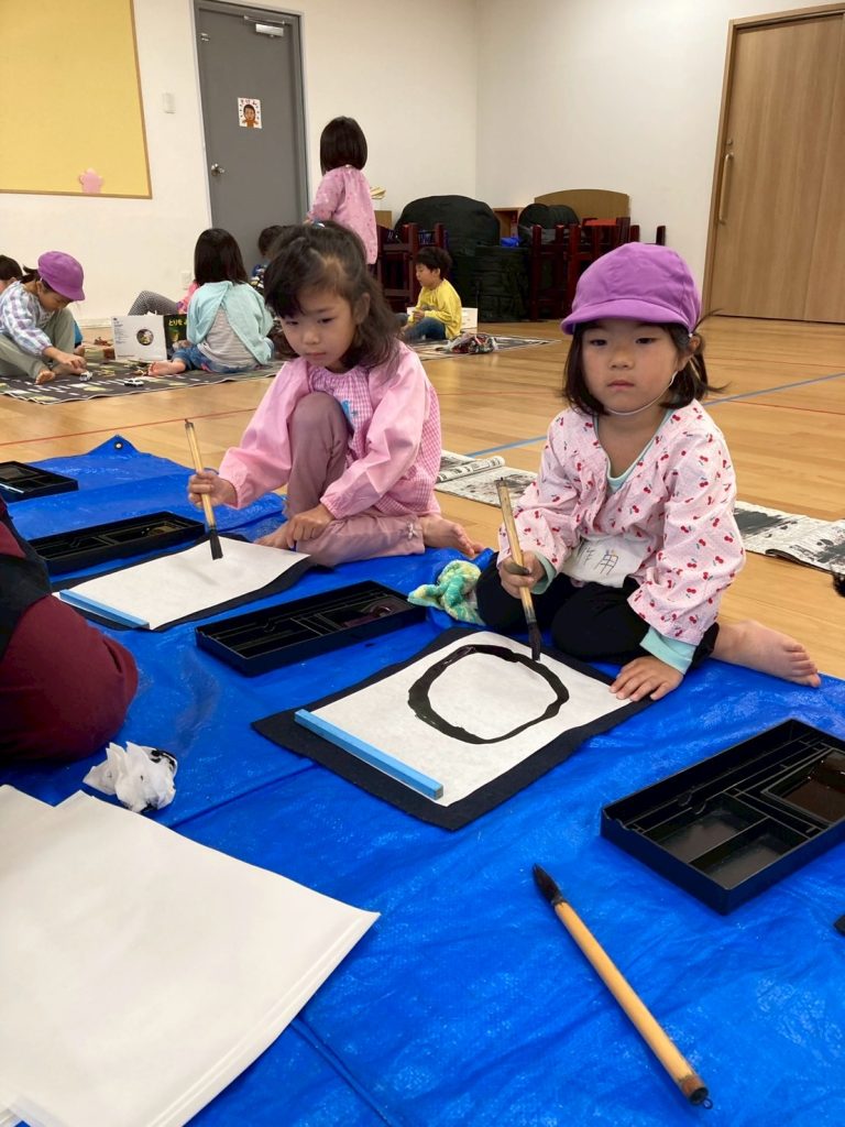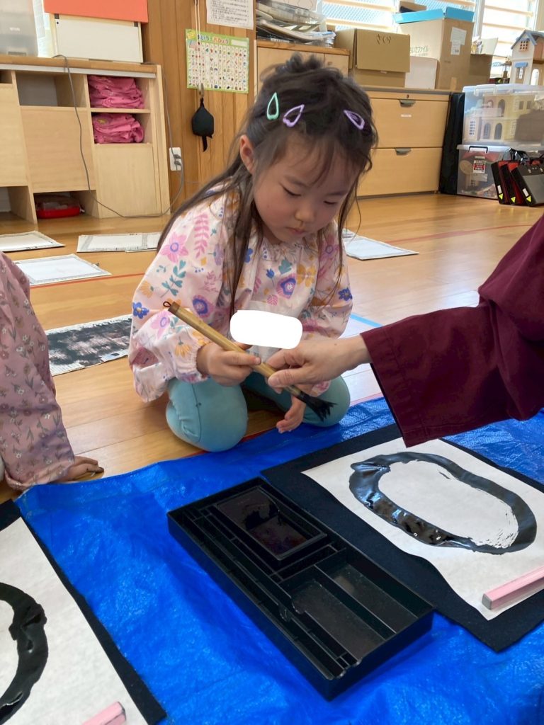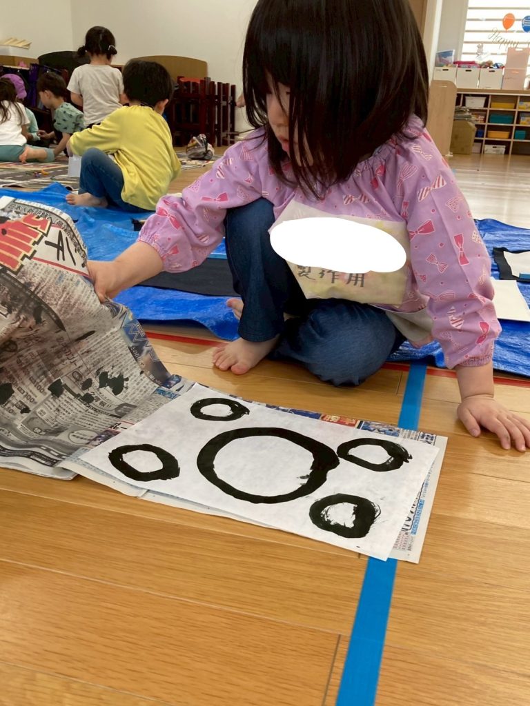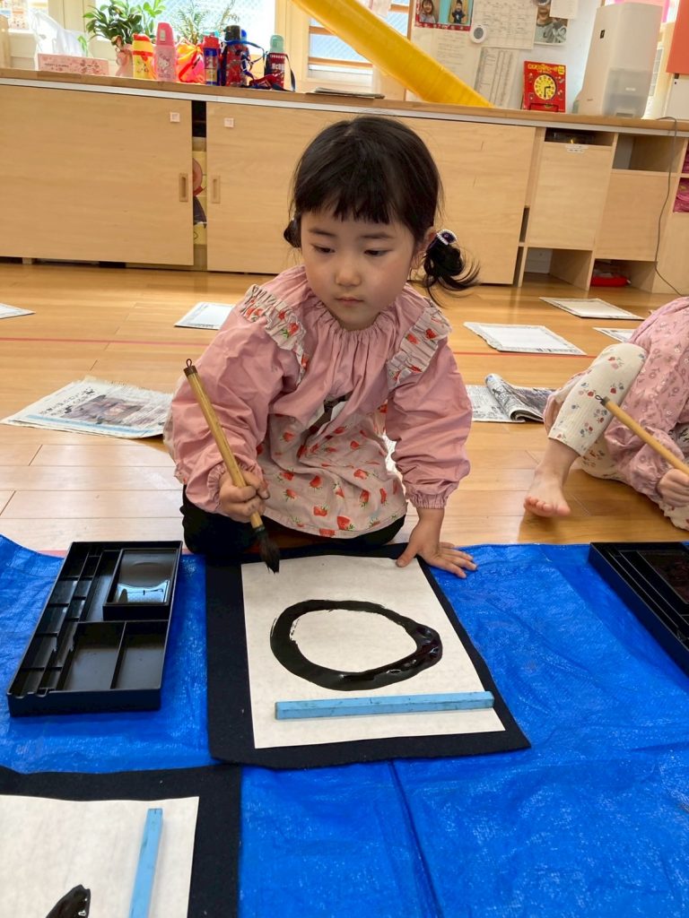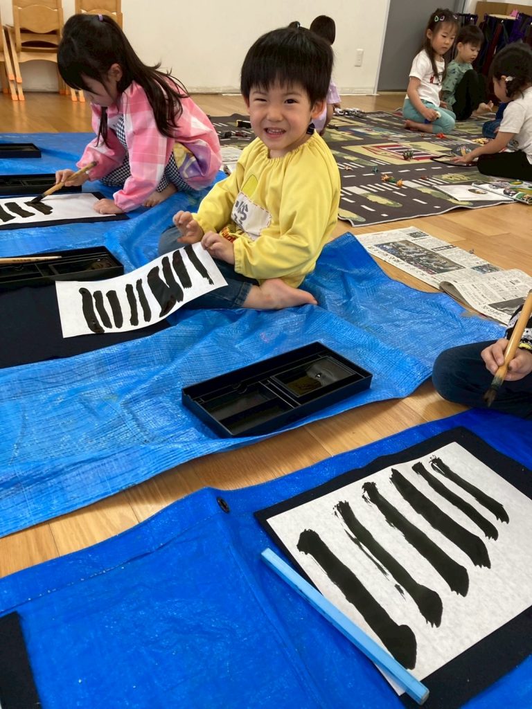 2025年05月21日(水) 5月21日 さくら組 今日は書道の日でした。 先生の話を聞いて挨拶をして始まりました。 座り方や筆の持ち方など前回教えていただいたことを確認しました。 そして、丸や三角や線を書きました。 みんな力いっぱい書いていました。