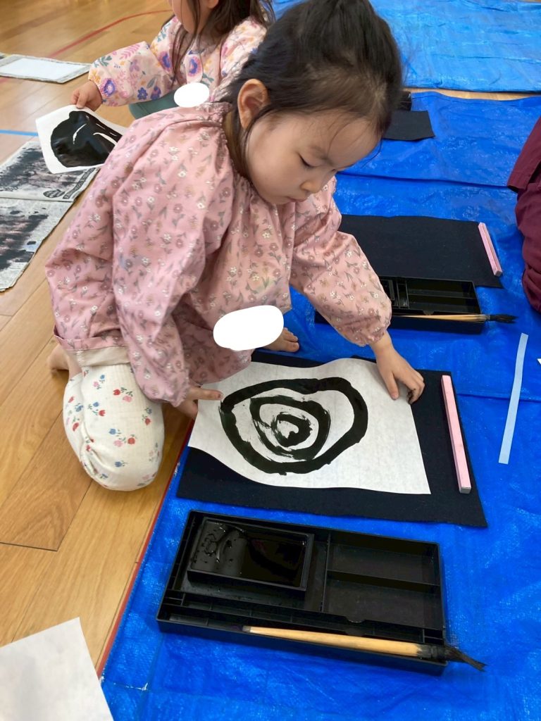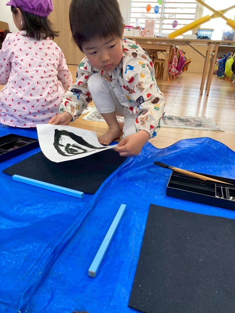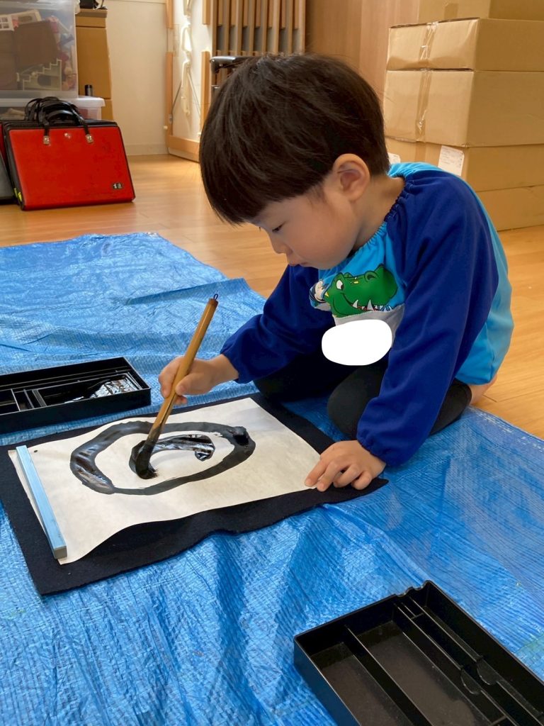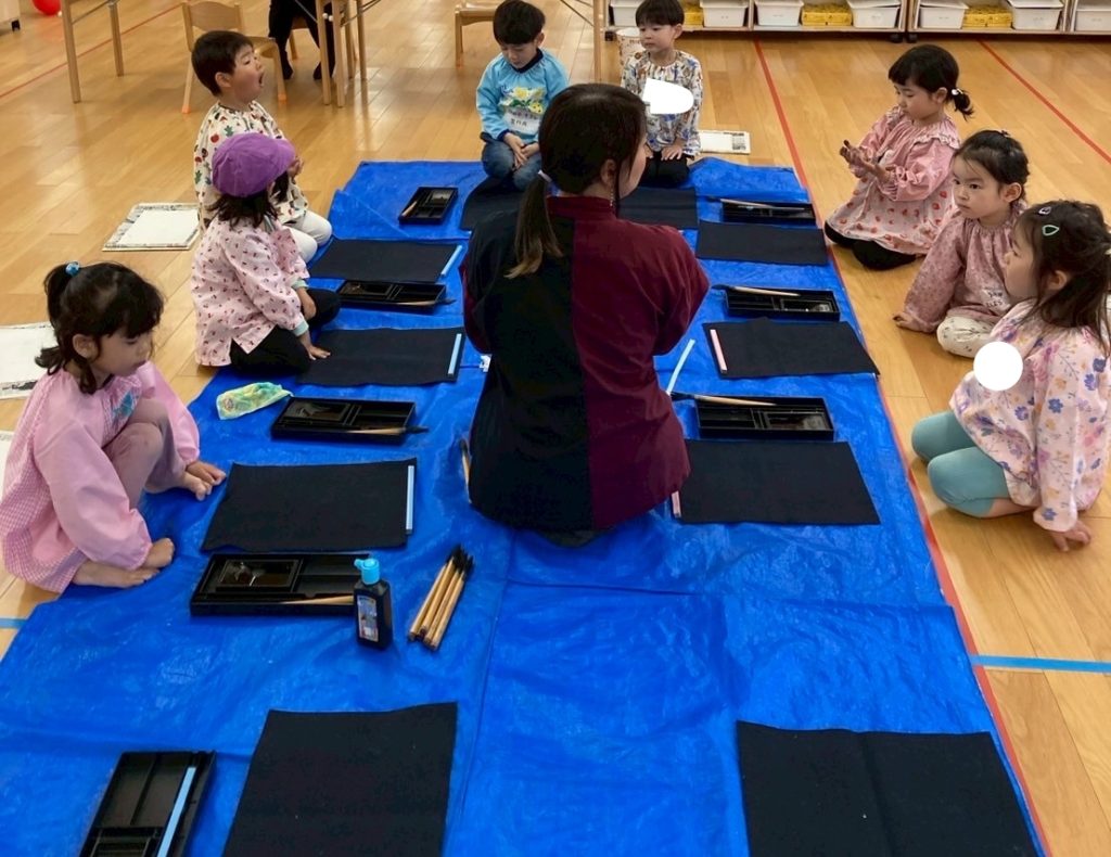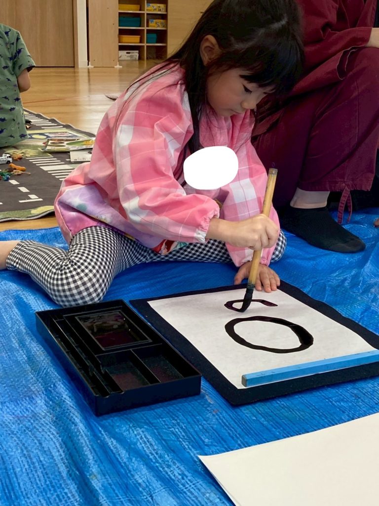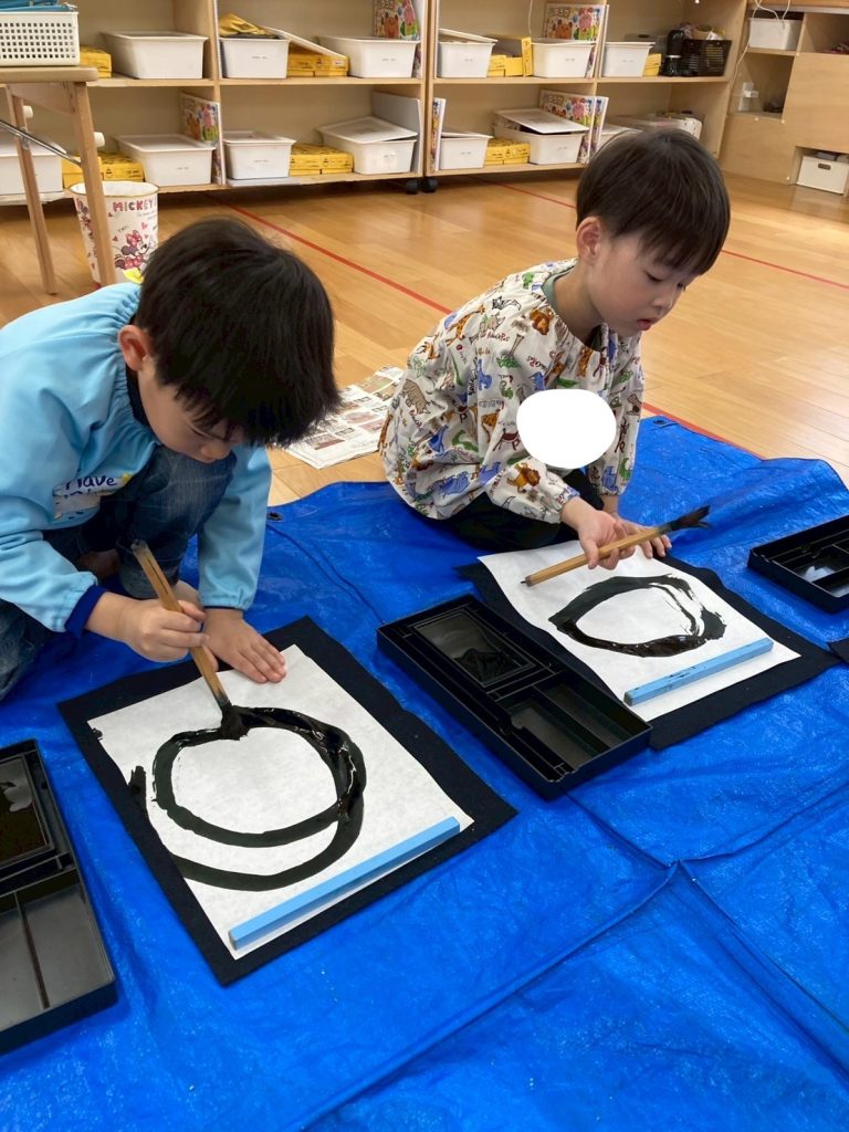 2025年05月21日(水) 5月21日 さくら組 今日は書道の日でした。 先生の話を聞いて挨拶をして始まりました。 座り方や筆の持ち方など前回教えていただいたことを確認しました。 そして、丸や三角や線を書きました。 みんな力いっぱい書いていました。