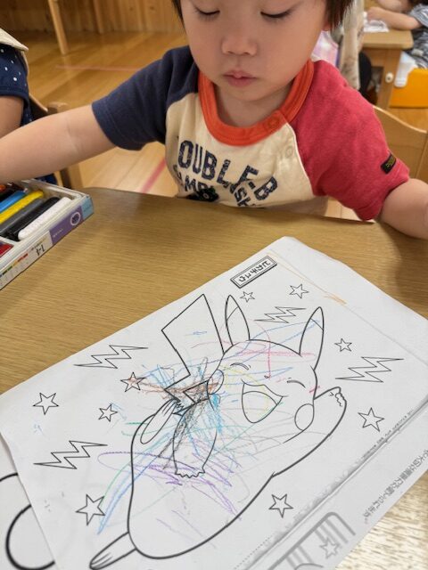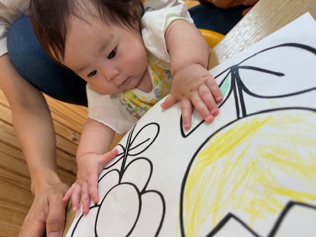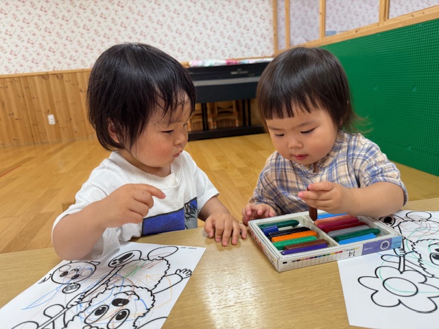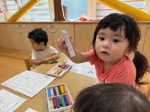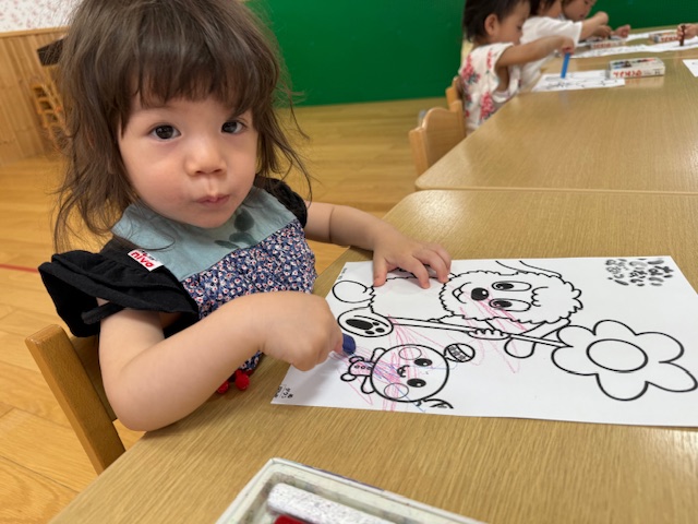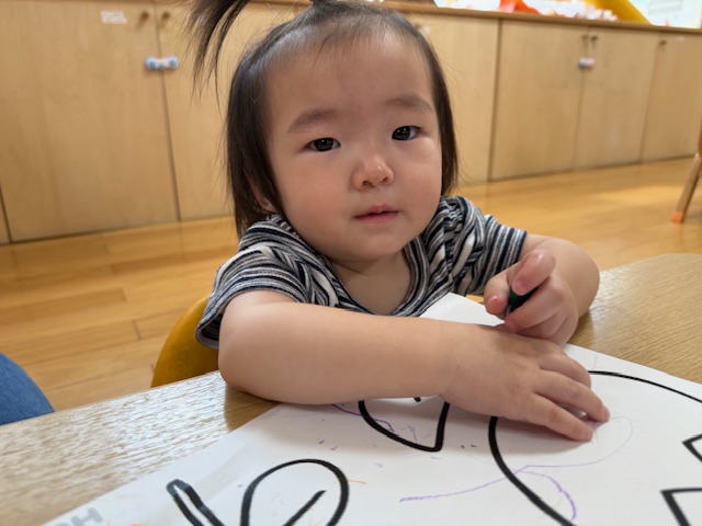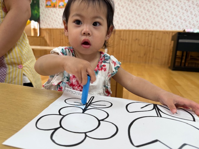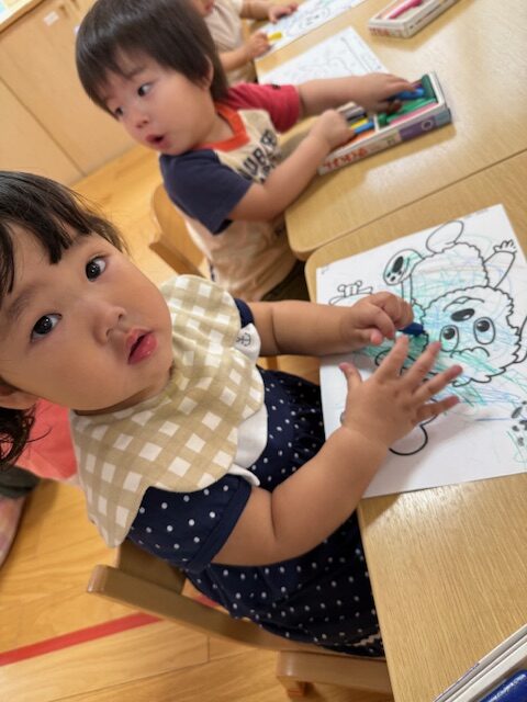 クレヨンを持つと集中して描いていたいちご、さくらんぼ組のお友達。