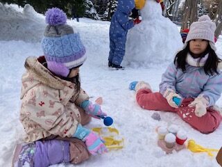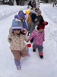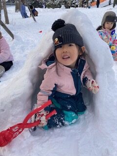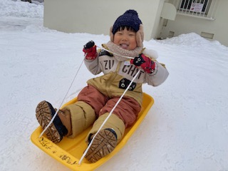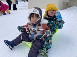公園ではそり滑りをしました。お友だちと一緒にそりに乗ったり、米ぞりですべり、後ろ向きになってしまうこともありましたが、とても楽しそうでした。