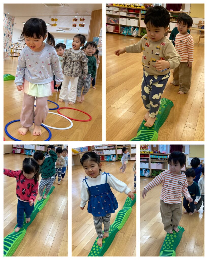両足でフープをジャンプしたり、バランスを取りながらウィープレイを歩いたりして遊びました。