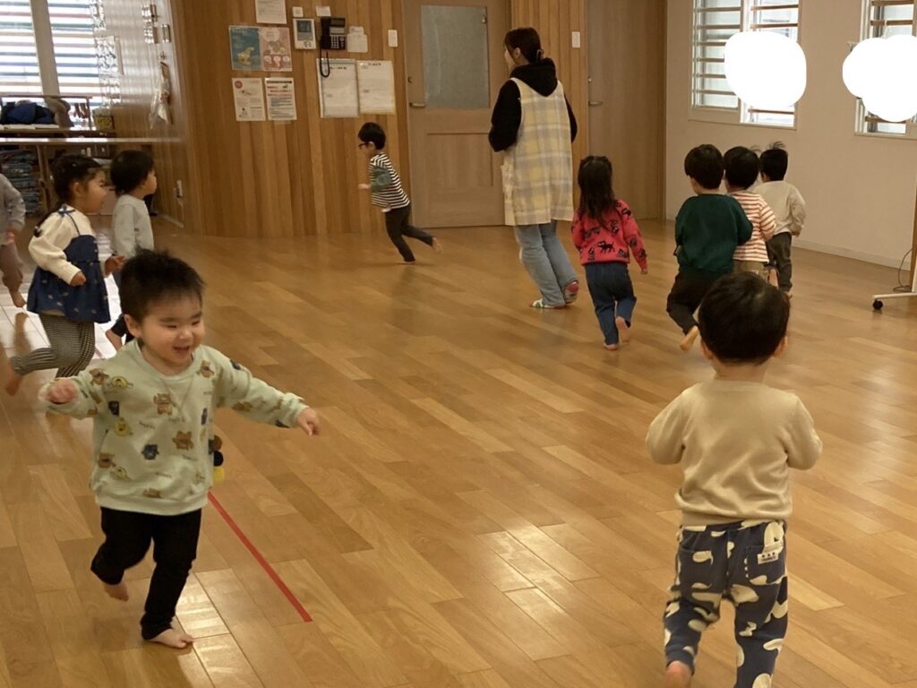 準備する保育者を見て「今日は何するの?」とワクワクしていたもも組さんです。