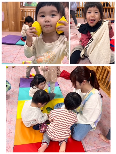 順番に製作を行ったので、自分の番が来るまでは野菜のおもちゃで遊びましたよ。カバンにたくさん野菜をつめて「ばいばーい!」とお出かけをしたり、先生がお店屋さんになってお買い物ごっこを楽しみました。