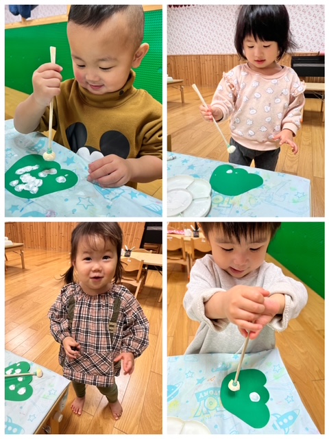 今日は1月の製作でタンポで獅子舞に模様をつける作業をしました。