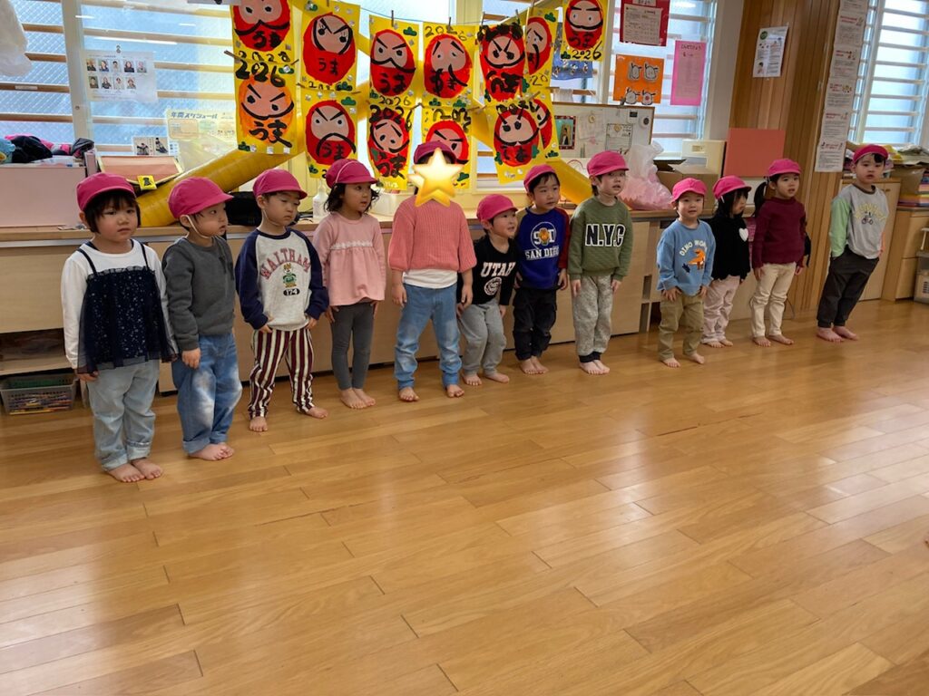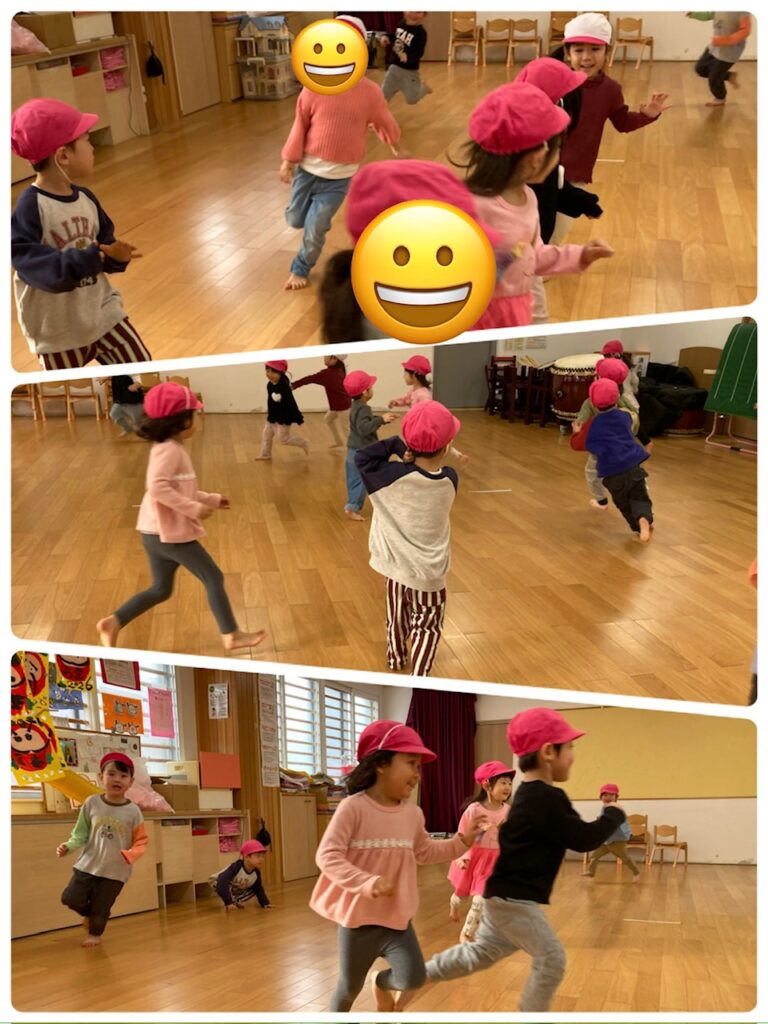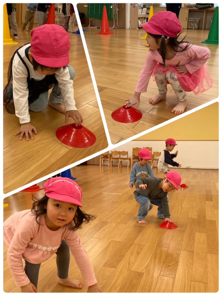何度も行ってきた運動なので、とても上手になりました。楽しさからか、戻ってからの気を付けピッを忘れて後ろまで行き過ぎてしまうお友だちもいたので、止まることを繰り返し伝えていきたいと思います。