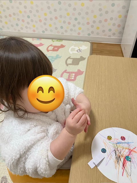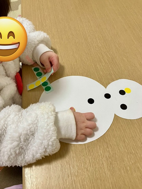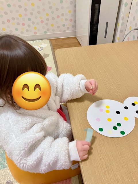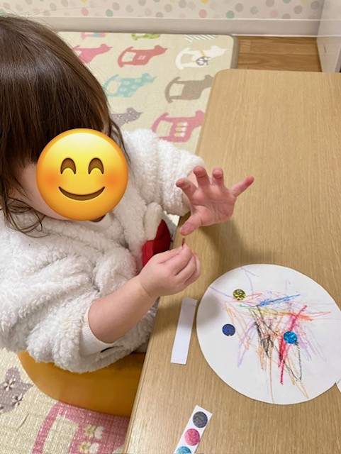 キラキラのシールは薄くて扱いが難しく、指先にくっつきやすいのですが、自分ではがして上手に貼ることができていました。