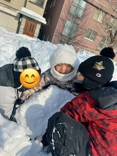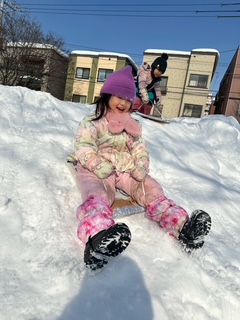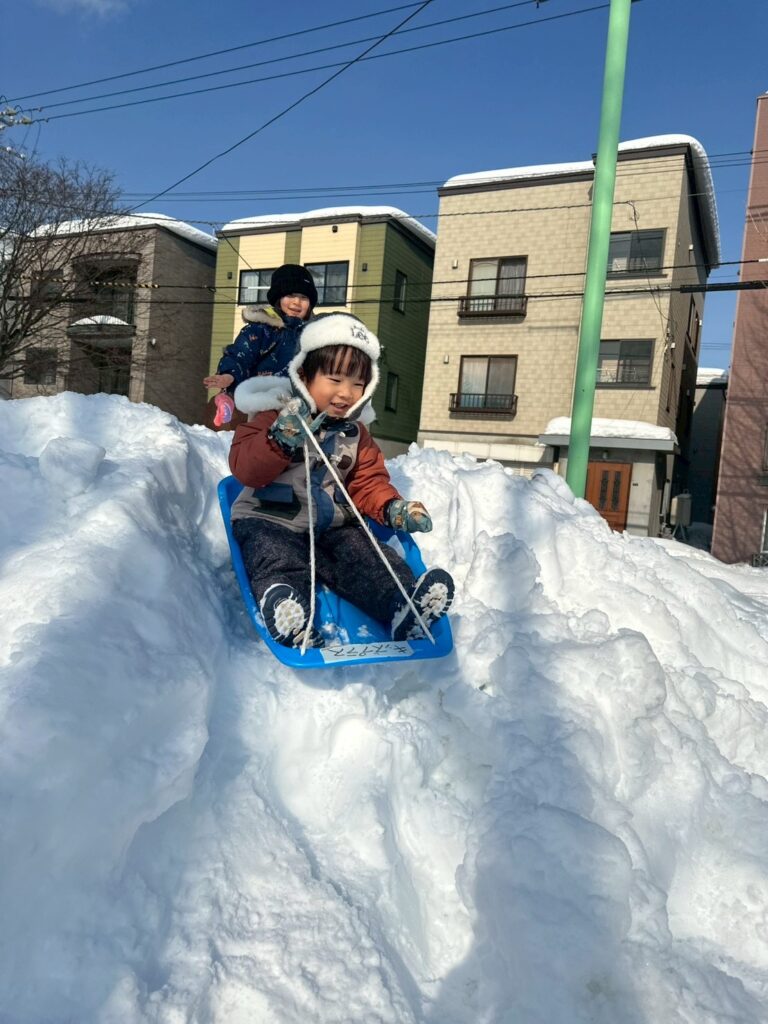 雪が良く固まっていて、アスレチックのような公園内の雪山を登ったり、走り回ったり、元気いっぱい体を動かしました。