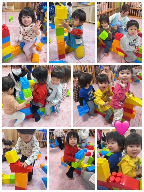 最初は一生懸命高く積み上げて遊んでいましたが、段々とお家やバイクなど難しいものにも挑戦。先生たちにお手伝いしてもらいながら作っていましたよ。出来上がるとお友達と一緒にバイクや電車に乗って楽しんでいました。
