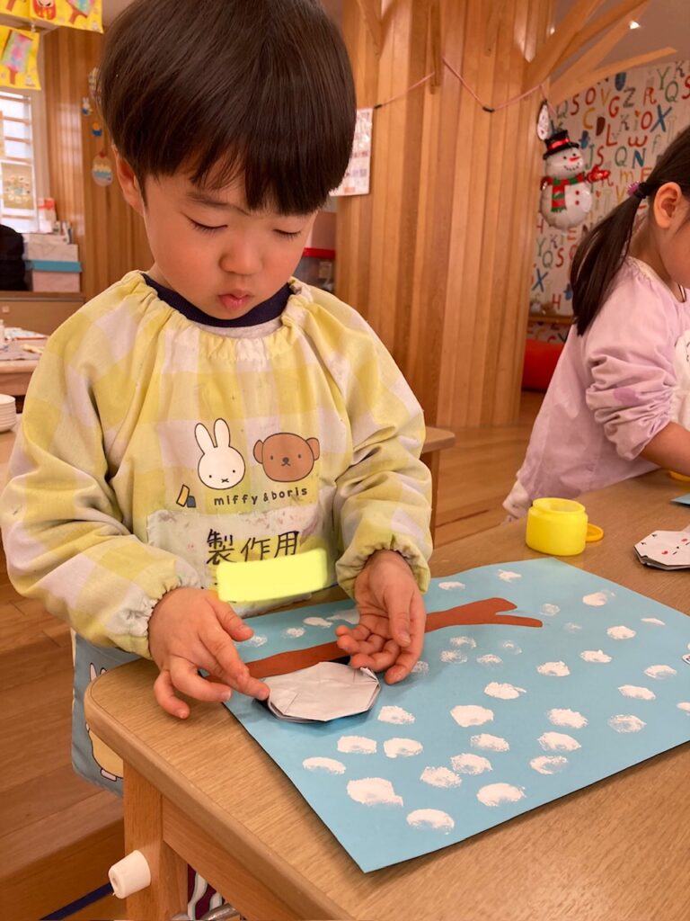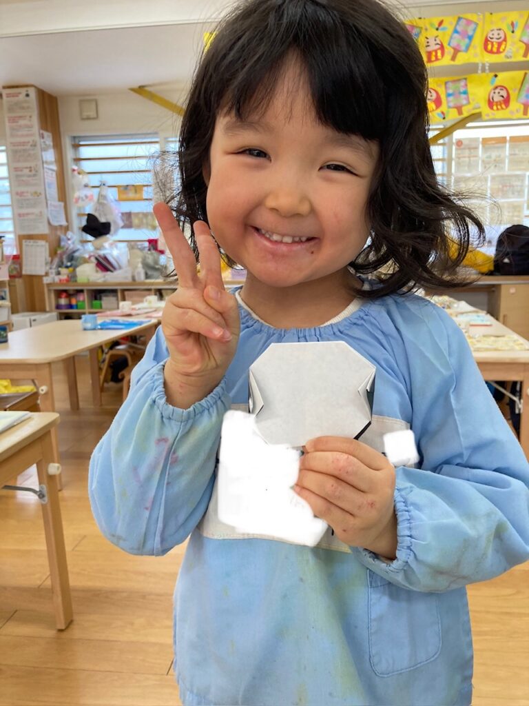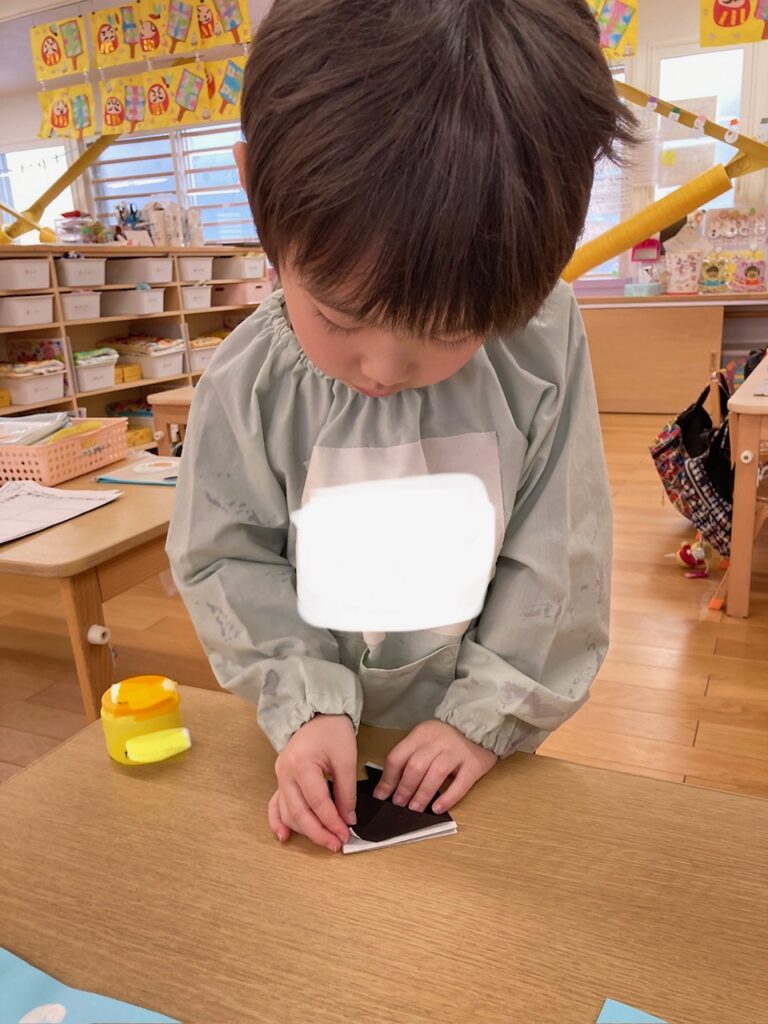 難しかったのか、とても集中し無言で取り組んでいて、糊を貼る時にやっと笑顔が溢れました。
