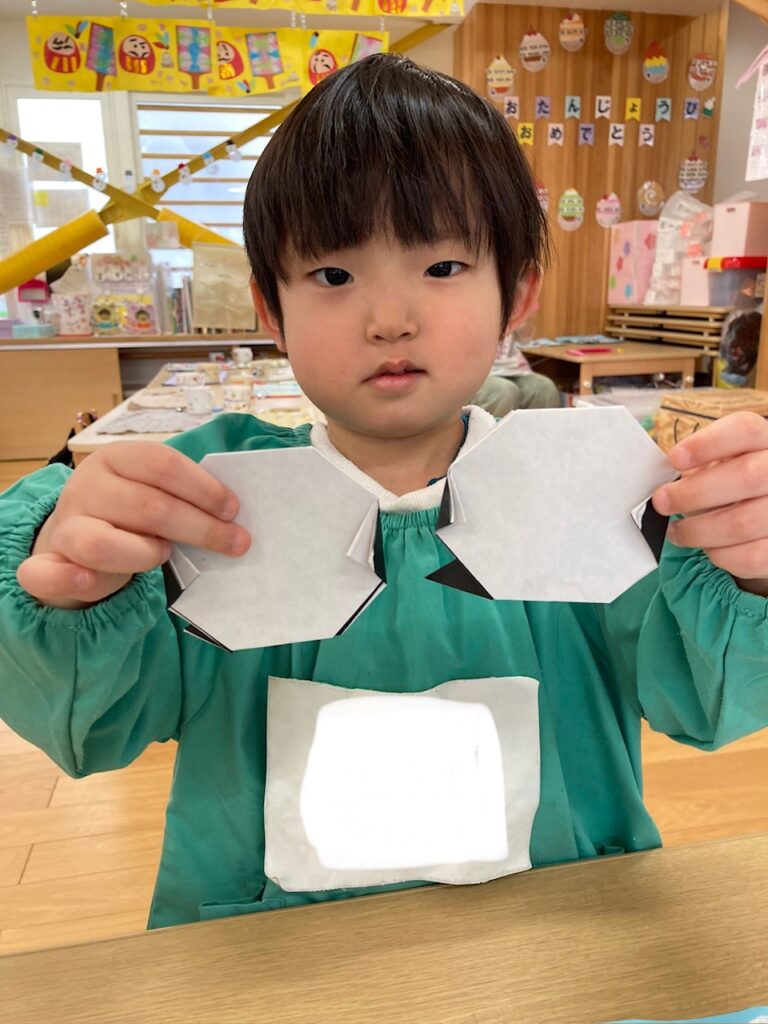折り紙を折って2匹のシマエナガを完成させた子どもたち。