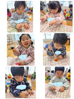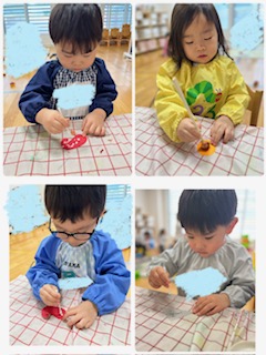 午後は2月の製作【おでん】の具材作りをしました。タコとがんもどきとこんにゃくを作りました。タンポと綿棒スタンプで色付け、模様付けをしました。