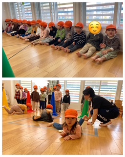 スポーツでは、コーンにタッチしてスタート位置に戻ったり、犬やワニに変身して歩いたりしました。