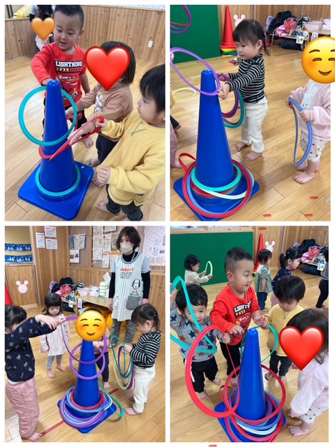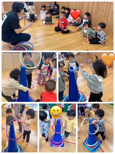 まずは【輪っか入れゲーム】です。フープを三角コーンに入れます。夢中でフープを拾いコーンに一生懸命入れていましたよ。