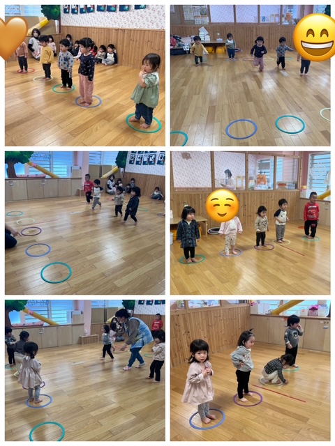 次はフープを1つだけ手に持ってコーンに入れる、たくさん持つのはいけませんというルールを作りやってみました。きちんと理解して1つずつ入れていましたよ。
