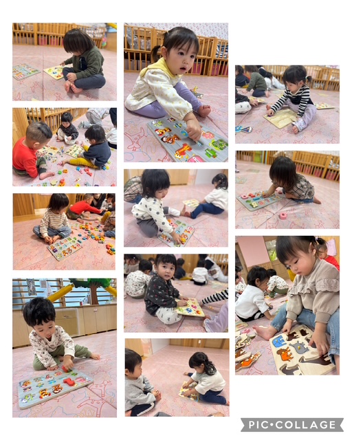 今日は予定を変更して朝のダンスをして身体を沢山動かした後、型はめパズルをして過ごしました。それぞれ動物や車、果物など好みの絵のパズルを手にして、1人でじっくりと進めたり友達と協力し合い1枚のパズルを完成させたりと諦めずに最後まで取り組む姿がありました。