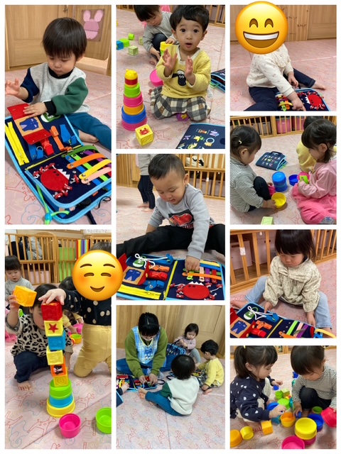 2026年02月13日(金) 2月13日 いちご組 今日は【知育あそび】をしました。知育バッグや大きさの違うカップをたくさん積んで遊びましたよ。子ども同士での関わりが増えて、お友達と協力してカップを高く積み「きゃー!」と手をパチパチ叩きながら盛り上がる姿も見られました。