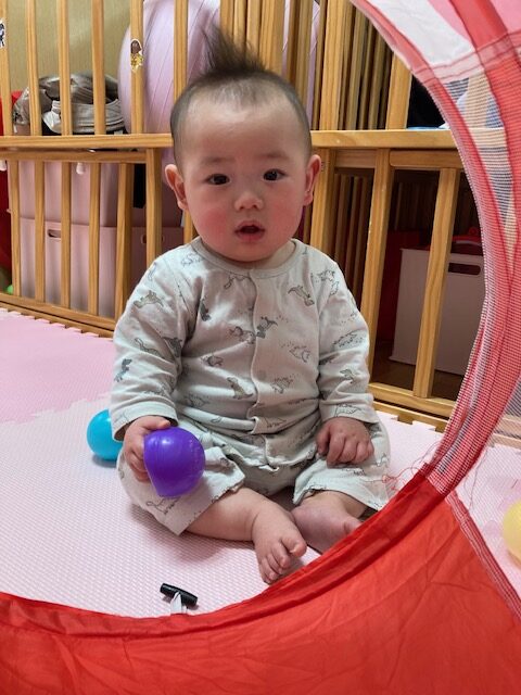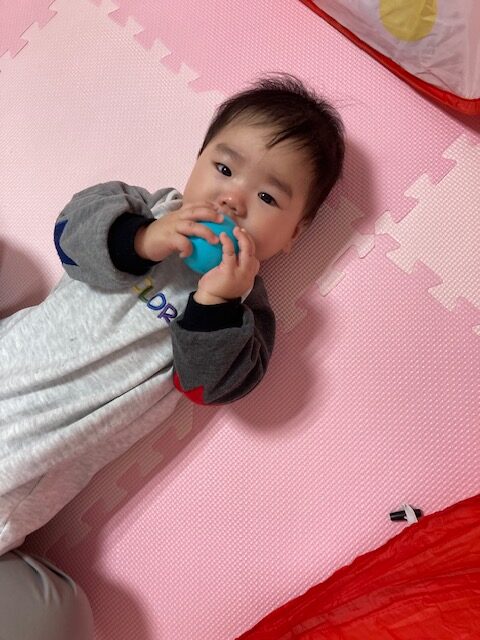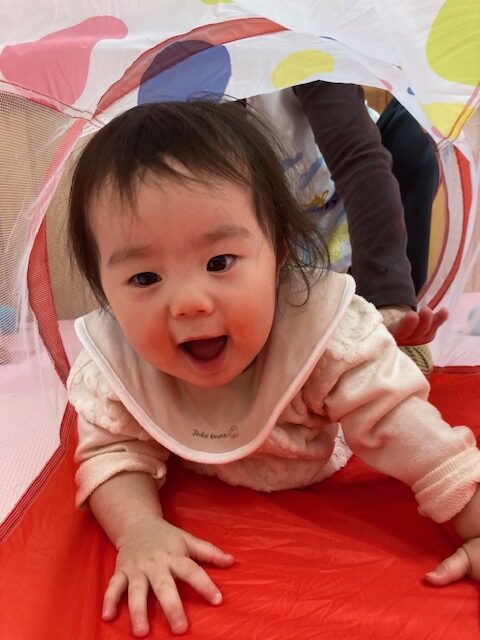 まだトンネルが難しいお友達は座ったり寝転んだままでボールを手にしたり、転がるボールを目で追って楽しんでいましたよ。